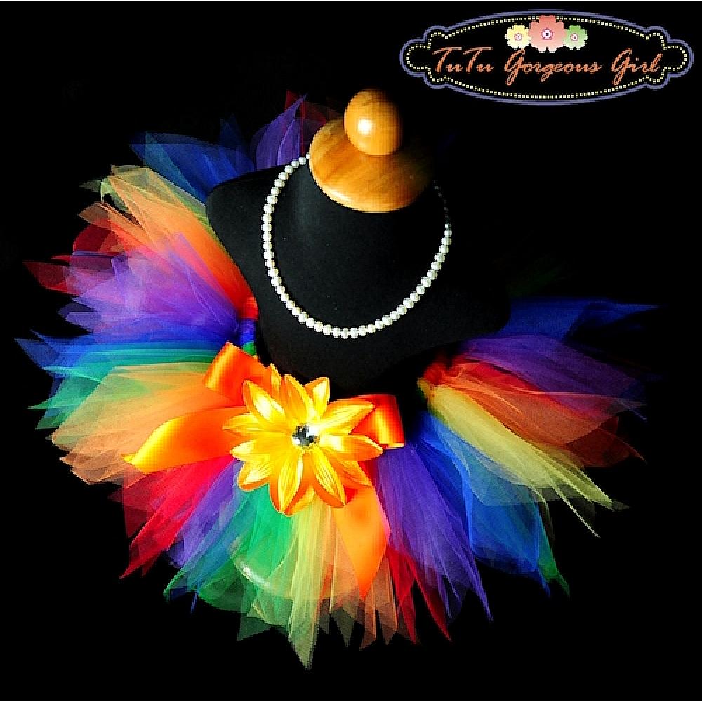 All the colors of the rainbow are showcased in this stunning tutu. Red, purple, royal blue, emerald, yellow and orange are a gorgeous combination for a photo shoot, birthday tutu or dance recital costume. Tutu includes a satin bow at the waist and optional flower clip and stretch headband.