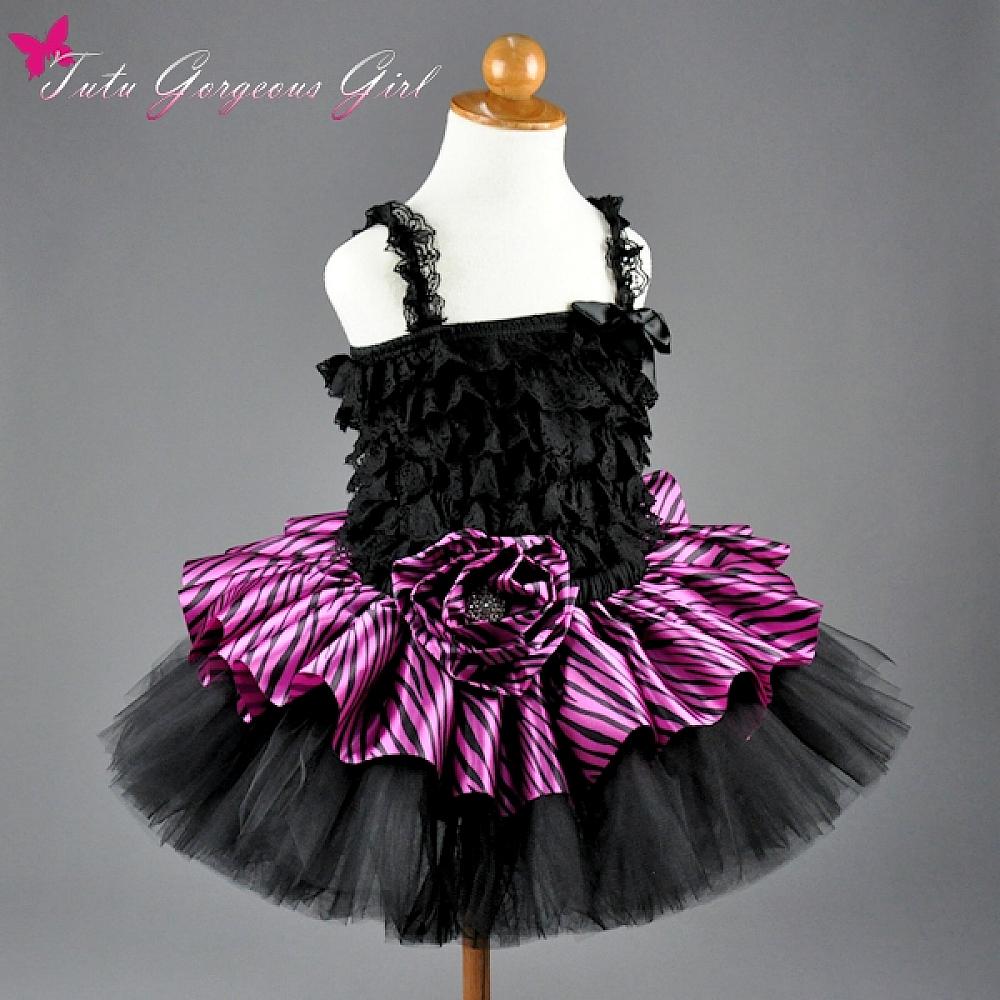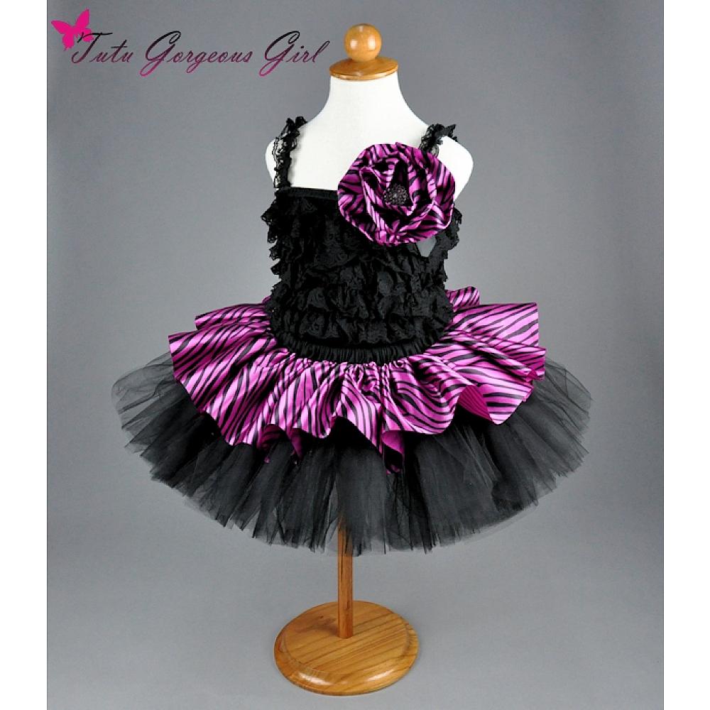 The Divalicious tutu skirt features a fuchsia and black zebra print satin ruffle for the top layer and black tutu underneath, and detachable fabric rosette with rhinestone decorative center.