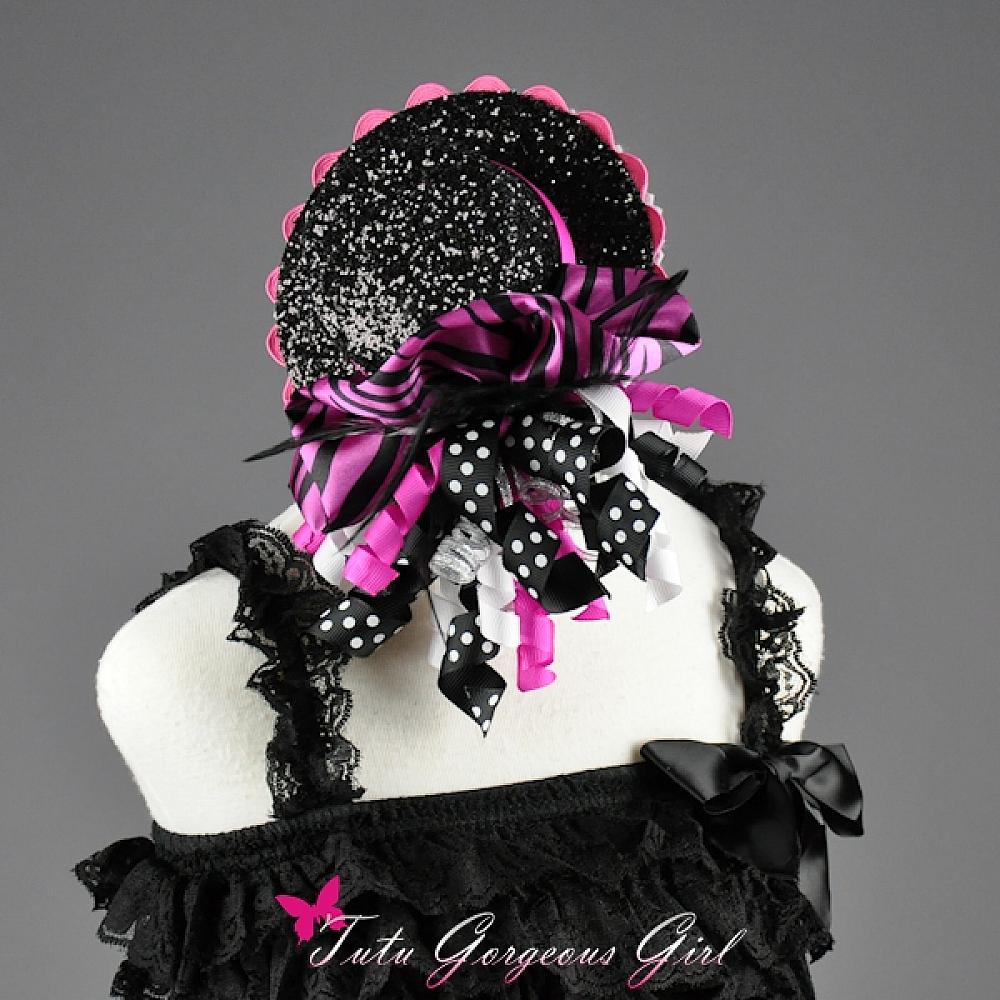 Add the black glitter mini top hat for the perfect accessory. The hat features white, black and hot pink korker ribbons, black feathers, pink ric rac trim and the same coordinating zebra print fabric.