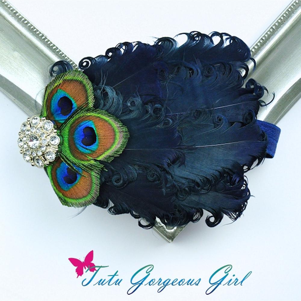 This stunning navy nagorie curly feather headband is accented with three trimmed peacock eye feathers and a beautiful decorative rhinestone center piece. The headband is made with a navy stetch satin elastic.