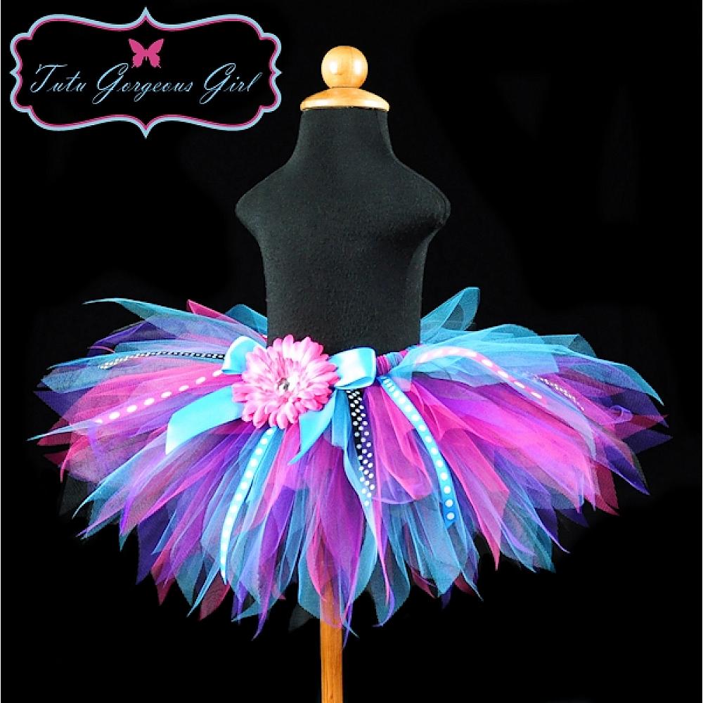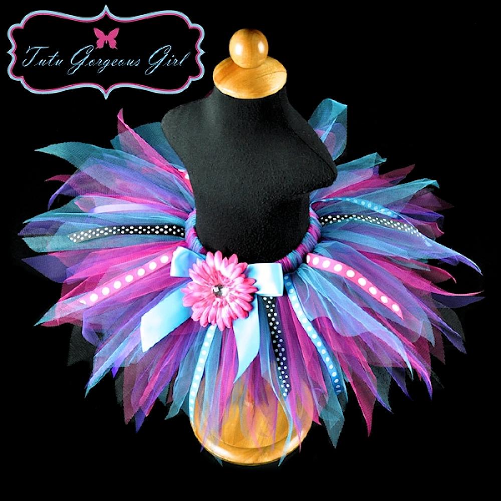 Girls birthday tutu skirt in turquoise, hot pink, black and purple tulle. This party perfect tutu features colorful polka dot and solid color ribbon streamers. Tutu includes a satin bow at the waist and optional flower clip and stretch headband.