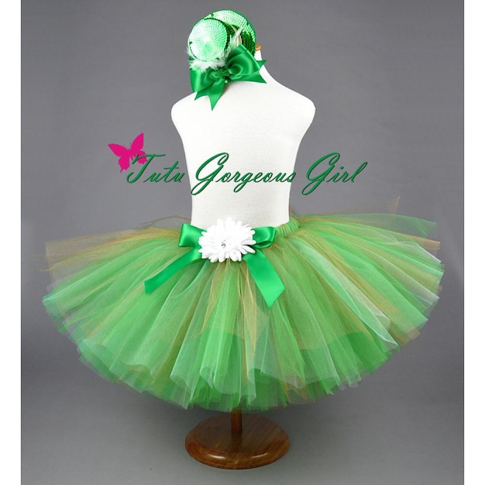 This St. Patrick's Day tutu is made with a beautiful combination of colors - emerald green, shimmering gold and white. Tutu includes a satin bow at the waist and optional flower clip and stretch headband.