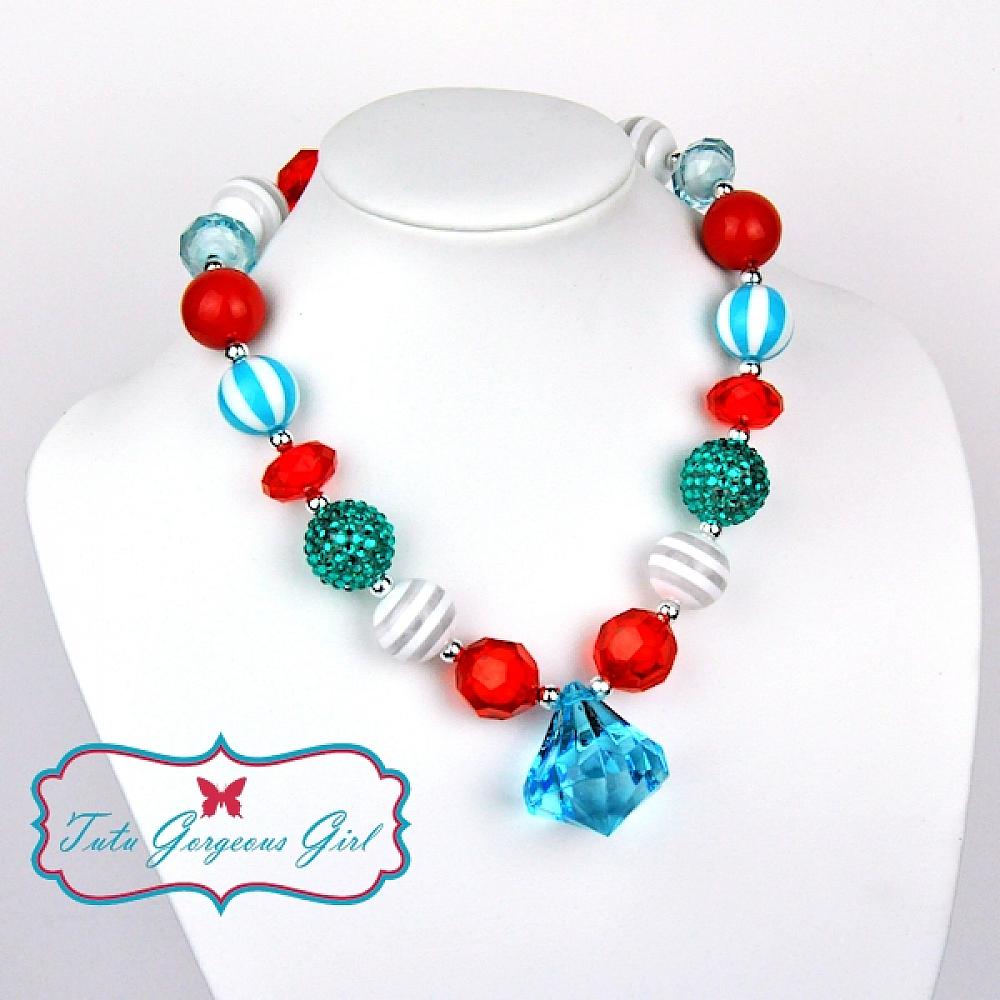 Red, turquoise and white chunky necklace with turquoise diamond pendant. This necklace is 18 inches in length.