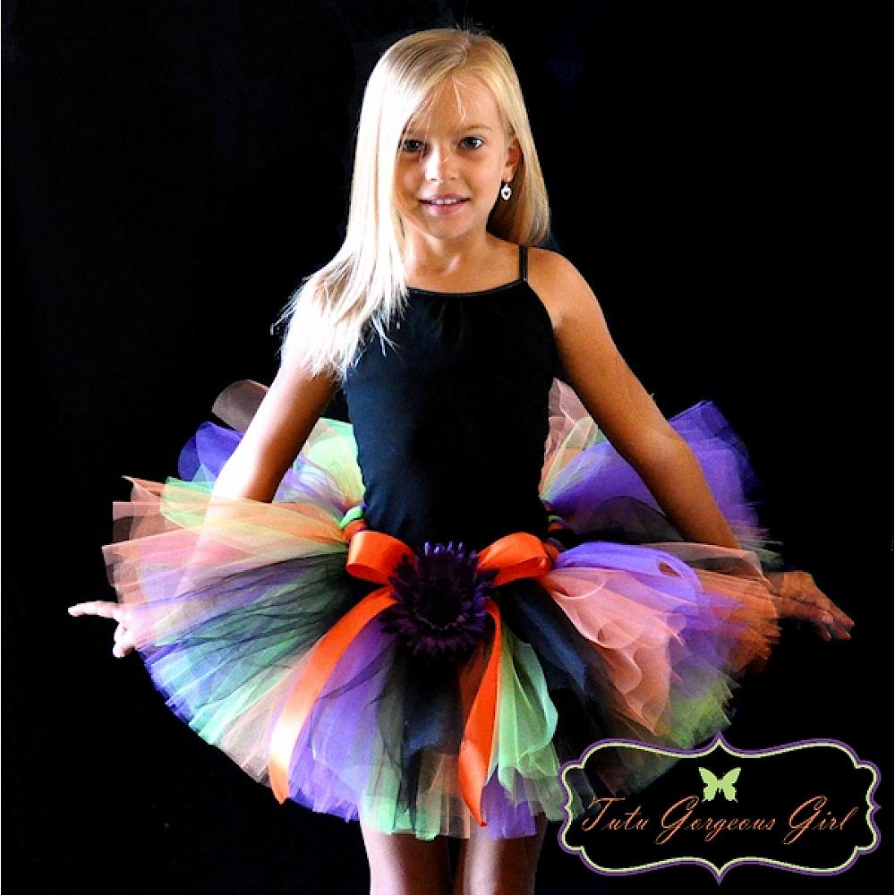 The Spooktacular Halloween Tutu features all of Halloween's favorite colors - orange, black, purple and apple green. This tutu makes a spooky but fun costume for trick-or-treating and Halloween portraits. Tutu includes a satin bow at the waist and optional flower clip and stretch headband.