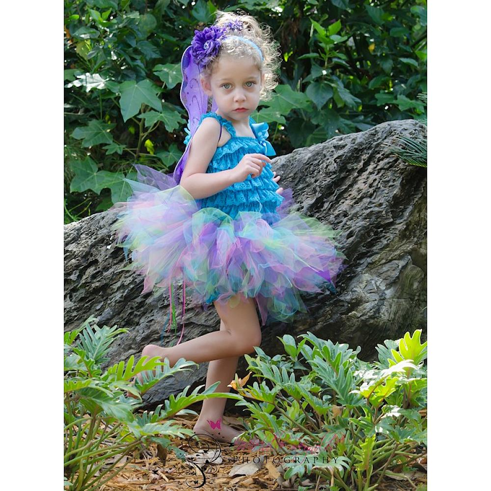 The Pixie Magic tutu is made with a glowing combination of colors - turquoise, bubblegum pink, purple and lime green tulle. The coordinating purple wings are decorated with glittered tips, ribbon streamers and a flower clip. The set also comes with a detachable flower clip and crochet headband.