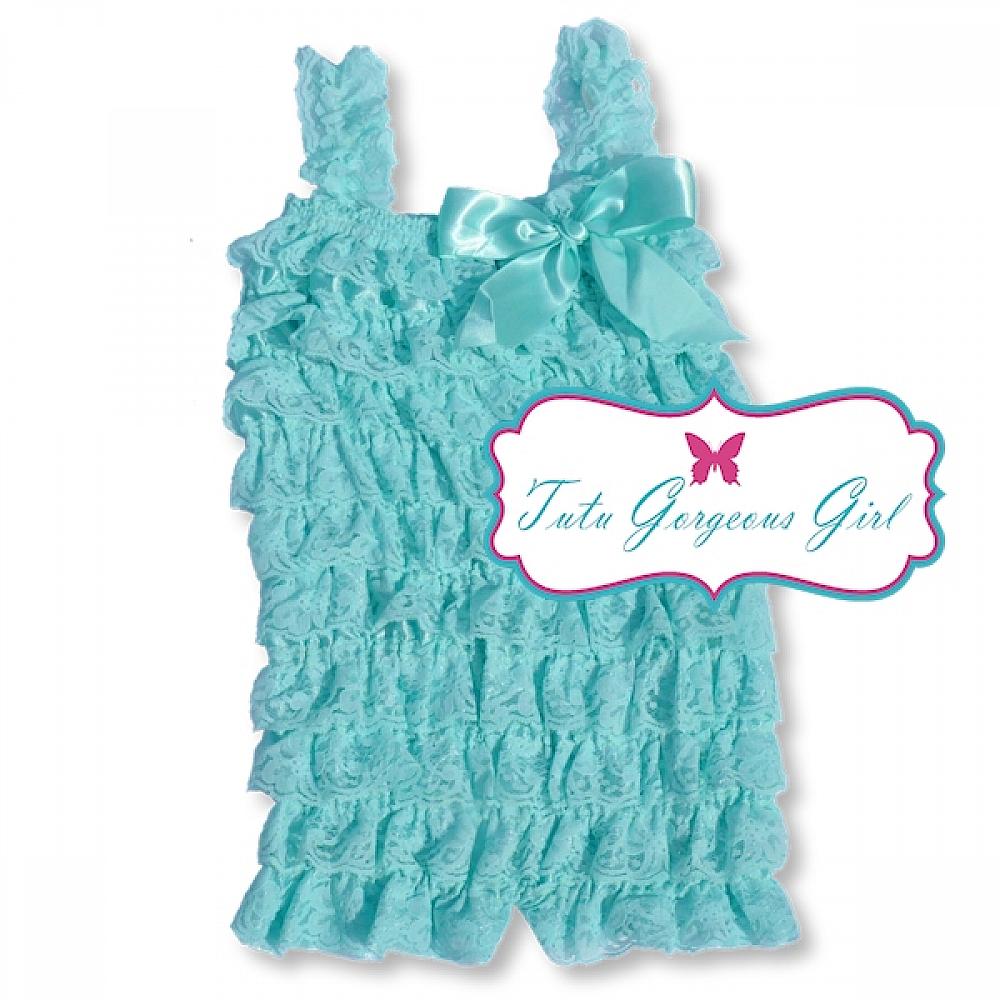The light aqua ruffled lace petti romper is perfect for pairing with tutus, petti skirts or wearing alone. A fabulous choice for portraits, birthday girls, special occasions or any day in between. Each romper is made with many soft layers of lace, and includes straps and a satin bow.