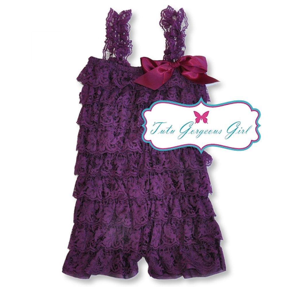 The plum ruffled lace petti romper is perfect for pairing with tutus, petti skirts or wearing alone. A fabulous choice for portraits, birthday girls, special occasions or any day in between. Each romper is made with many soft layers of lace, and includes straps and a satin bow.