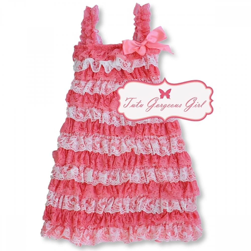 This charming light coral and cream lace petti dress is a beautiful choice for a summer portrait session, special occasion or everyday wear. This dress is made with many rows of soft stretch lace ruffles in light coral (peach) and cream, and provides plenty of stretch and comfort for your little princess.