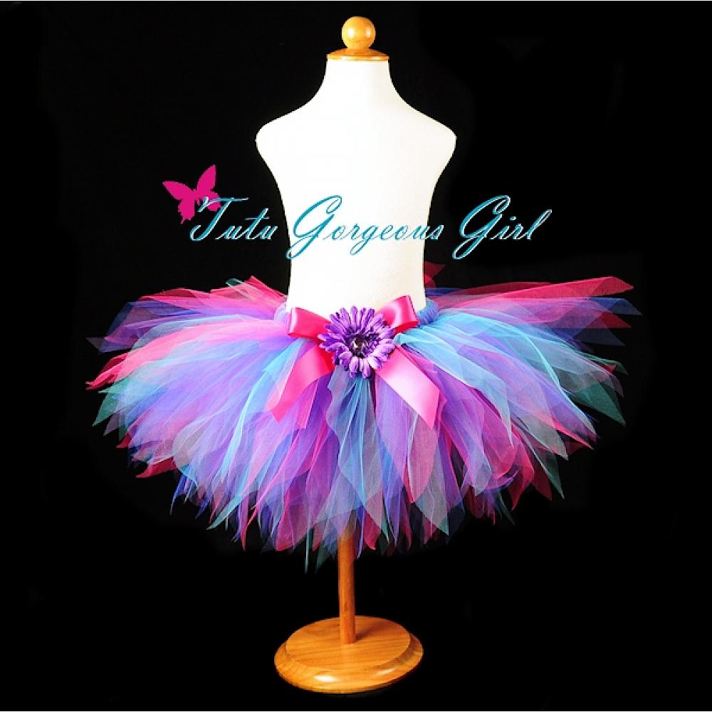 The Razzle Dazzle tutu features a fabulous blend of colors that are perfect for a birthday tutu, dance recital tutu or photo prop. This vibrant tutu is made with fuchsia, turquoise, royal blue and purple tulle. Tutu includes a satin bow at the waist and optional flower clip and stretch headband.