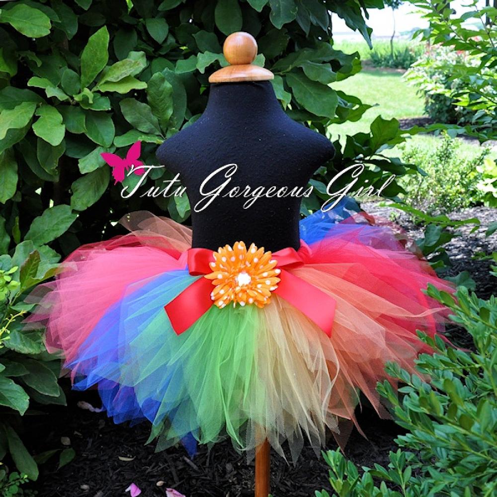 This fun rainbow birthday tutu features red, royal blue, emerald green, yellow, orange and coral tulle. A perfect tutu for a Sesame Street theme birthday, clown Halloween costume or photo shoot. Tutu includes a satin bow at the waist and optional flower clip and stretch headband.
