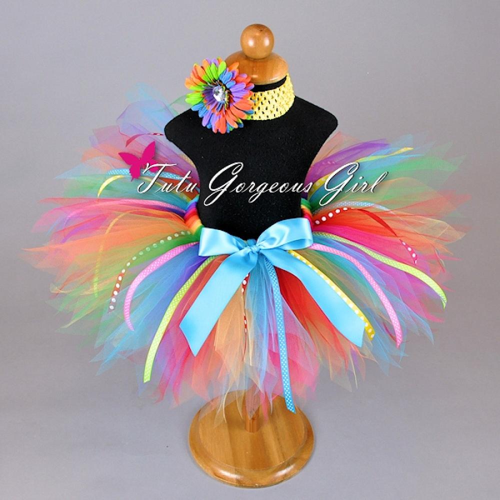 The Rainbow Bash Birthday Tutu features bold rainbow colors and fun polka dot ribbon streamers. This colorful tutu is perfect for a first birthday, clown Halloween costume or everyday fun. Tutu includes a satin bow at the waist and optional flower clip and stretch headband.