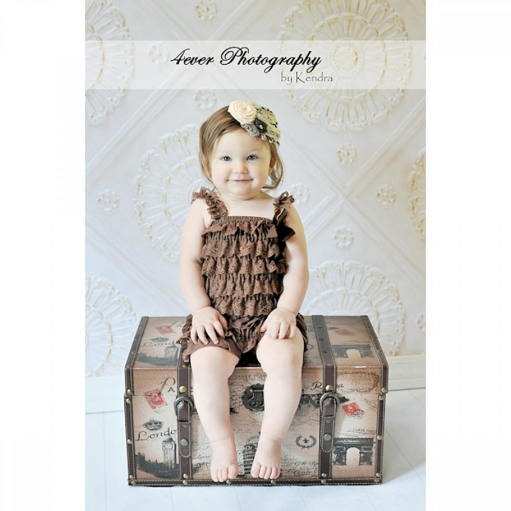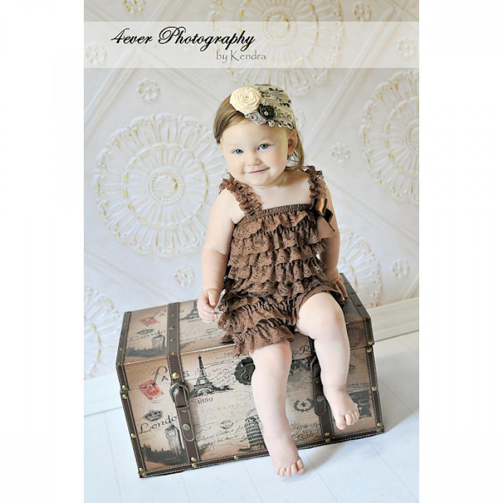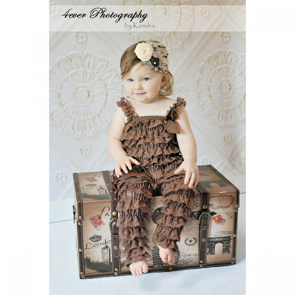 This chocolate brown ruffled lace petti romper is perfect for pairing with tutus, petti skirts or wearing alone, and is a fabulous choice for autumn shabby chic portraits. Each romper is made with many soft layers of lace, and includes straps and a satin bow.