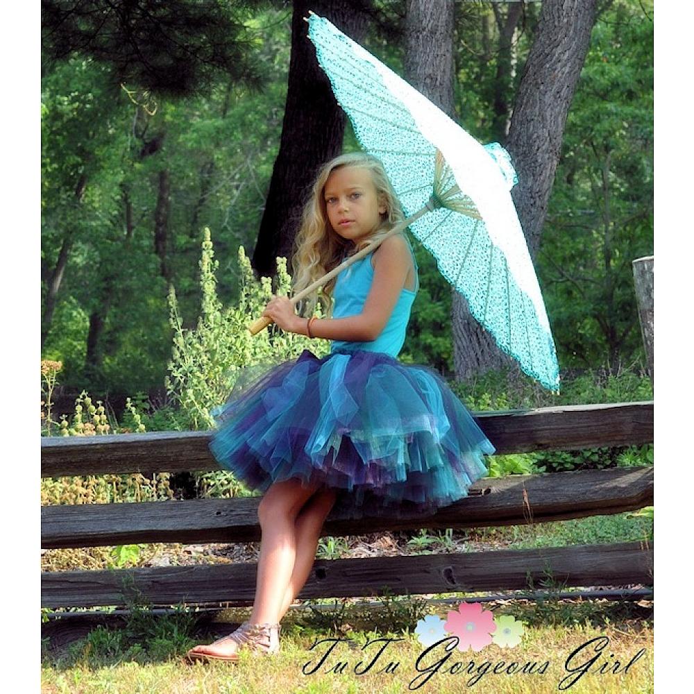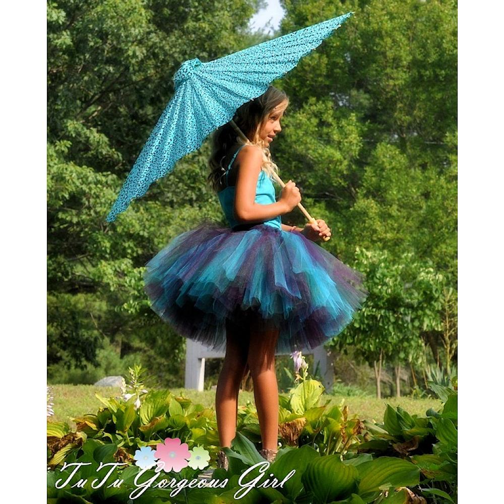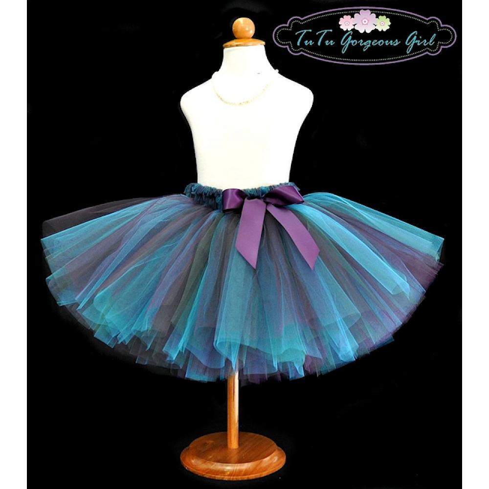 The Plum Crazy long tutu is stunning in plum, turquoise and hunter green tulle. This bold tutu is a fabulous choice for autumn portraits or a fall woodland flower girl tutu. Tutu includes a satin bow at the waist and optional ruffled waistband.