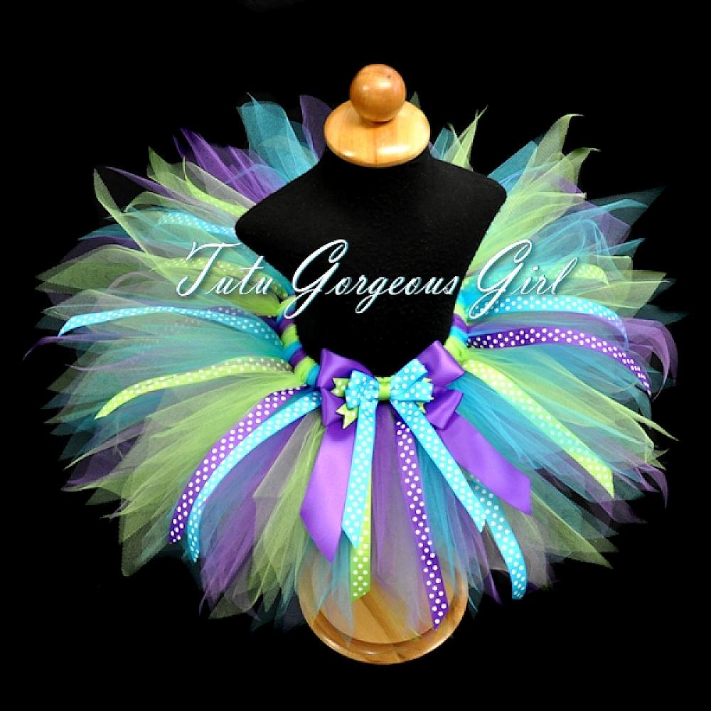 Tutu features lime green, purple and turquoise tulle, and is embellished with polka dot ribbon streamers. a fancy layered bow at the waist and an optional coordinating hair bow headband. This is a fabulous tutu for a girl's Monster Inc. themed birthday party or Halloween costume.