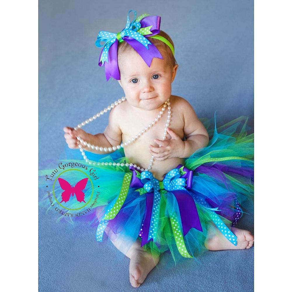 Turquoise Lime Purple Birthday Tutu with Polka Dot Ribbons and Hair Bow...