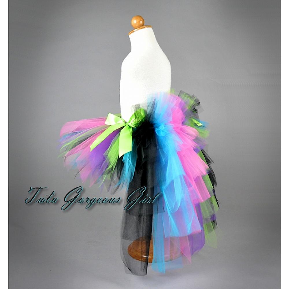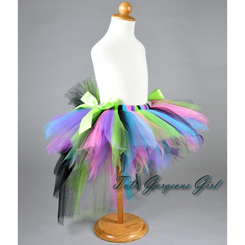 The Rock Princess bustle tutu features black, turquoise, bubble gum pink, purple and lime green tulle. This is a fabulous tutu for a rock star Halloween costume, punk rock theme birthday or pageant tutu. Bustle tutu includes two satin bows tied at each size of the bustle.