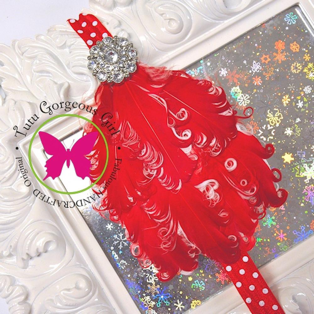 Christmas or Valentine's Day red and white curly feather headband. Features your choice of headband color and a beautiful rhinestone centerpiece. A perfect accessory for your Holiday portraits, Valentine's Day party or special occasion.