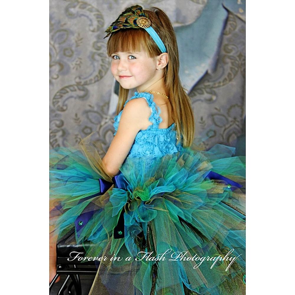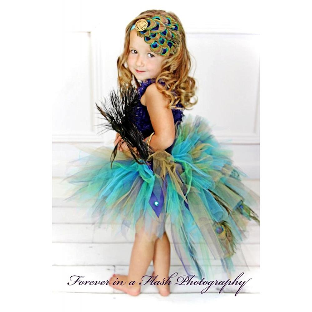 This baby girls and toddler size peacock inspired bustle tutu is stunning in shimmering gold, turquoise, navy and emerald green tulle, and features a gorgeous peacock feathered bustle and two satin bows at the sides. A stunning tutu for baby's portraits, toddler Halloween costume or pageant tutu.