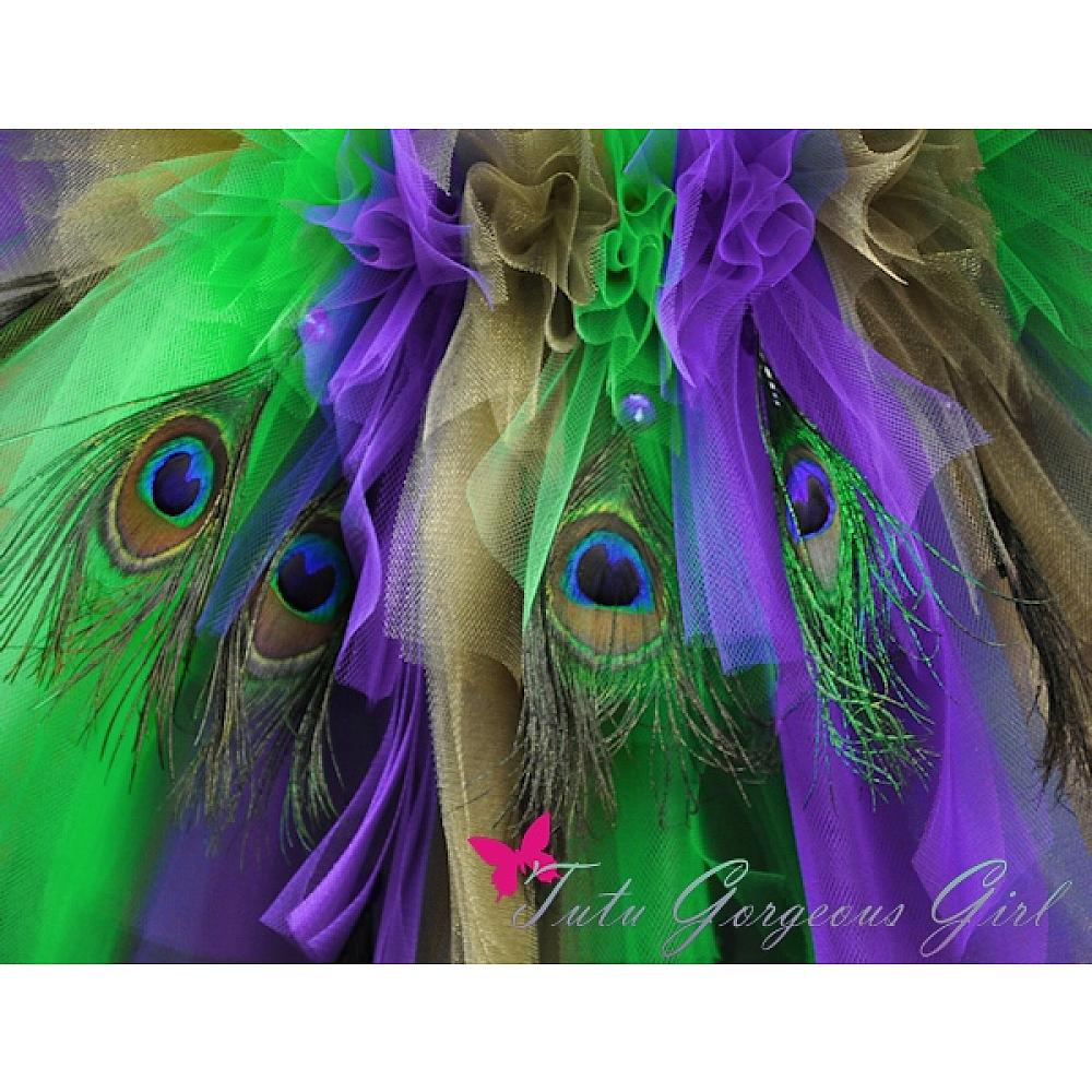 This tutu features emerald green, shimmer gold, and purple tulle. Two full rows of peacock eye feathers are securely attached to the bustle. And two satin bows adorn each side of the bustle.