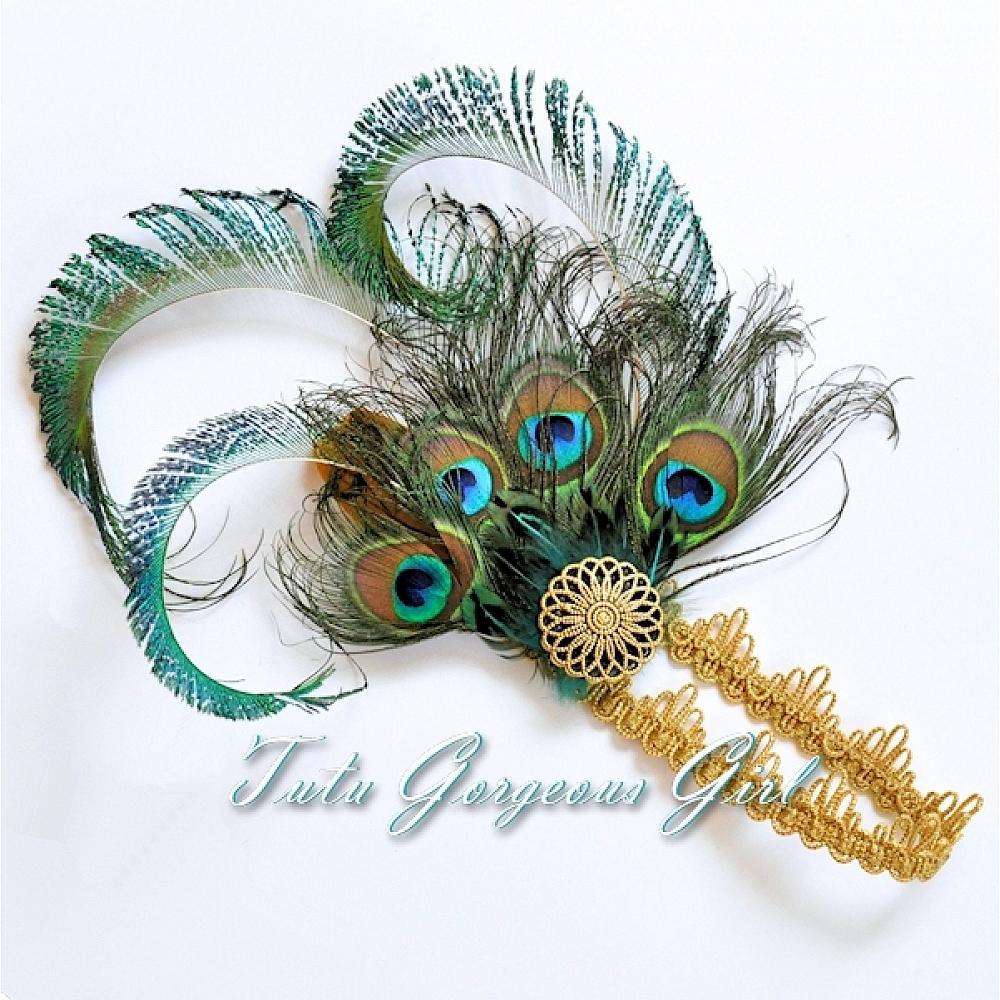 This Peacock hairpiece was designed to coordinate with our popular Peacock Bustle tutus. This roaring 20's inspired hair accessory is made with peacock eye feathers, hand curled peacock swords and a gold centerpiece.This headpiece comes in two options: with the metallic gold headband or without.