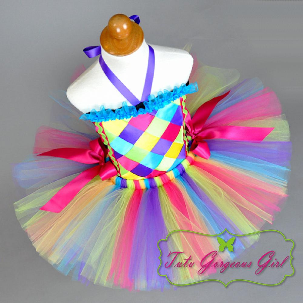 Multi color girls birthday outfit. This stunning yellow, hot pink, purple, turquoise and lime green Birthday Carnival tutu set includes tutu with two satin bows at each side of the waist, and a stretch black tube top with multi color woven ribbon front. For ages 1 - 12 years only.