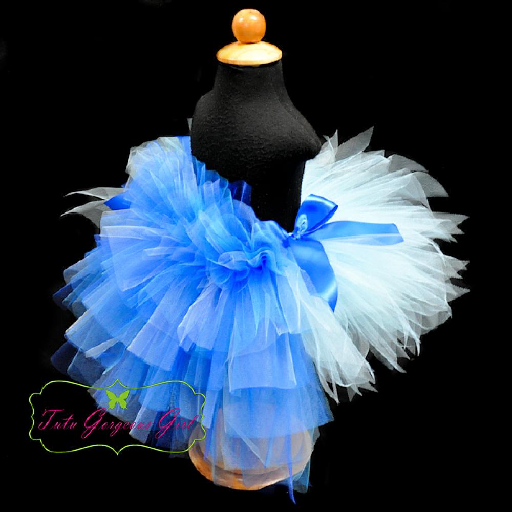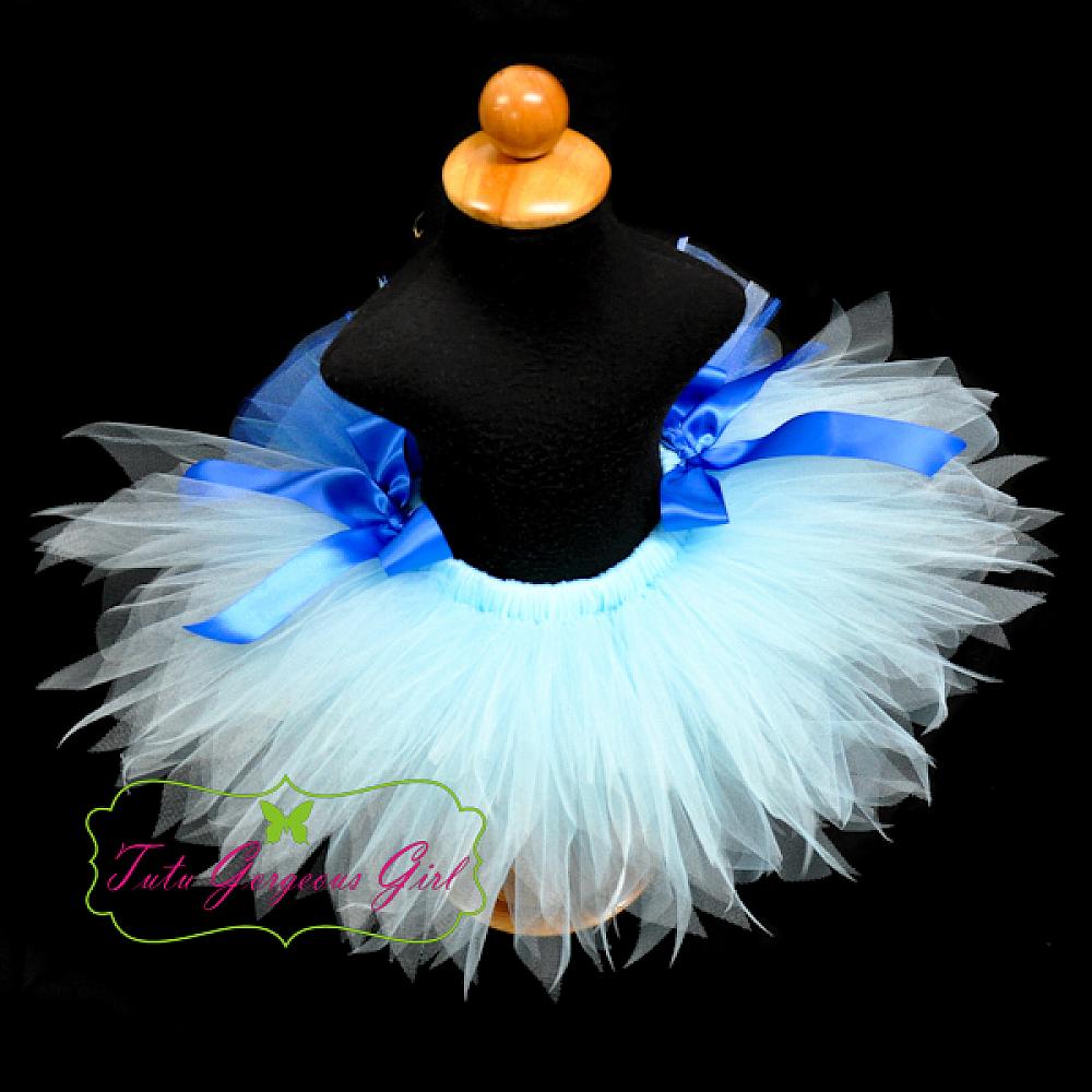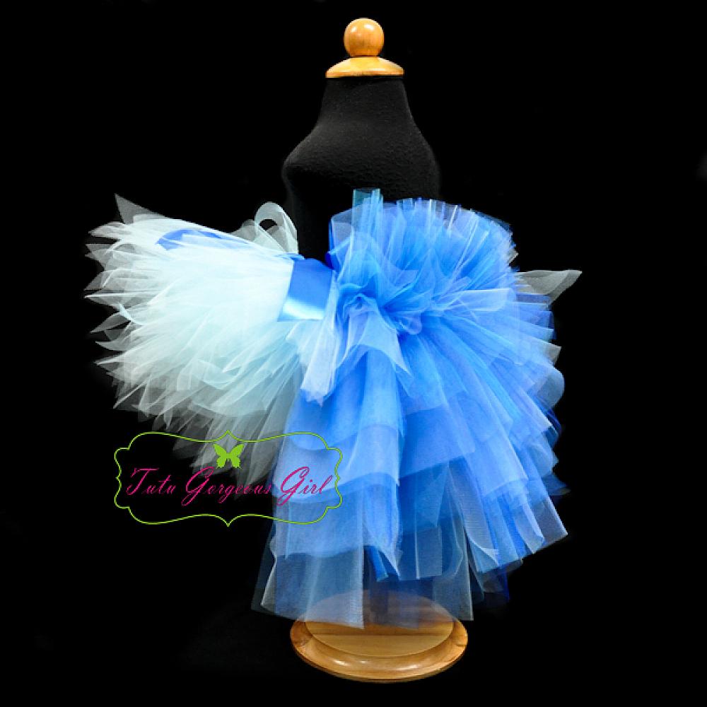 The blue macaw bustle tutu features a darker blue bustle, or tail, and a light blue front tutu that mimics Jewel's belly. This tutu is a wonderful addition to a Halloween Jewel Rio or blue macaw costume. Bustle tutu includes two satin bows tied on either side of the bustle.
