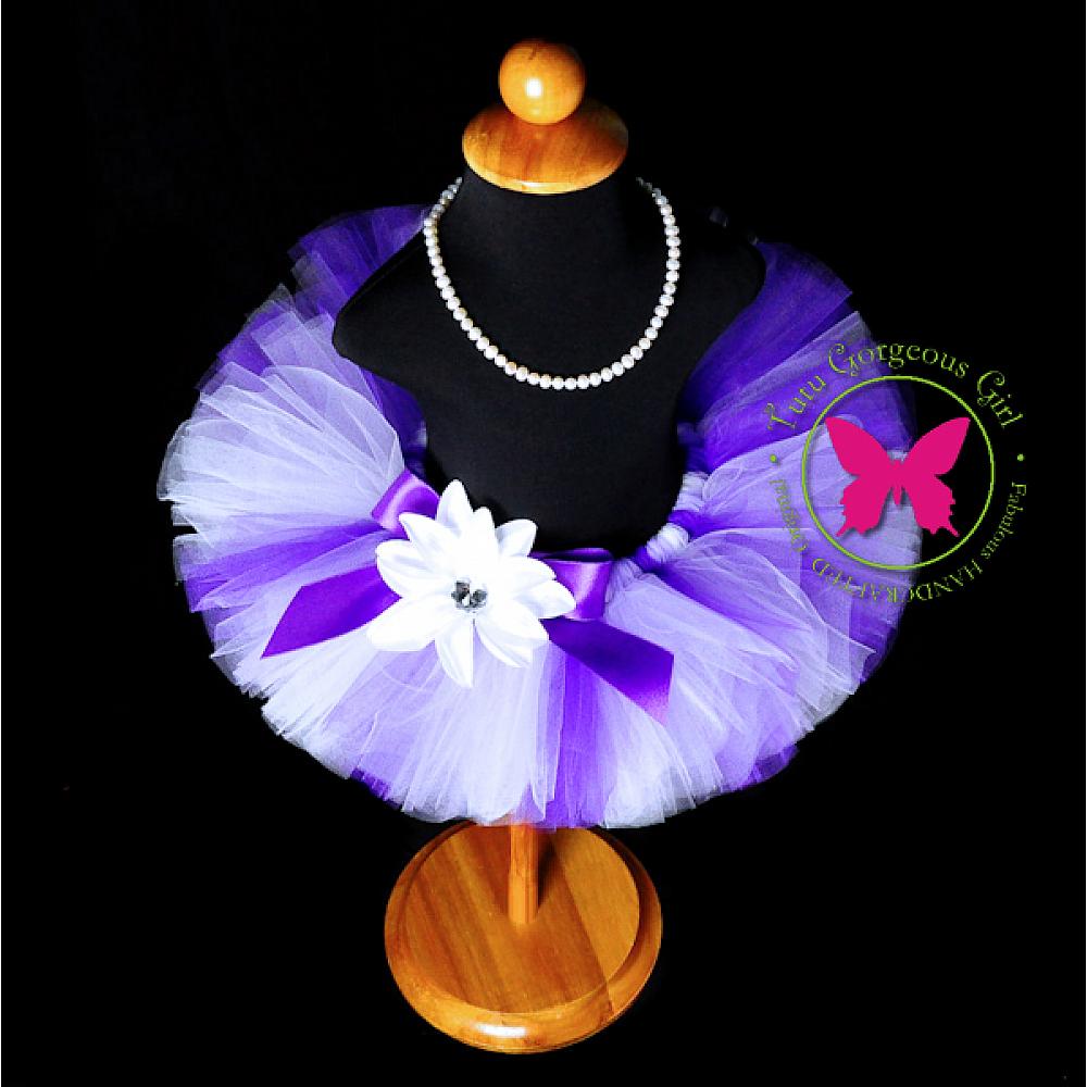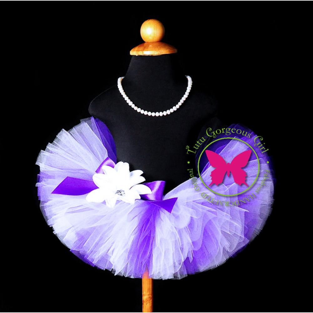 Lavender, purple, and white tutu, purple first birthday tutu or dance tutu. Tutu includes a satin bow at the waist and optional flower clip and stretch headband.