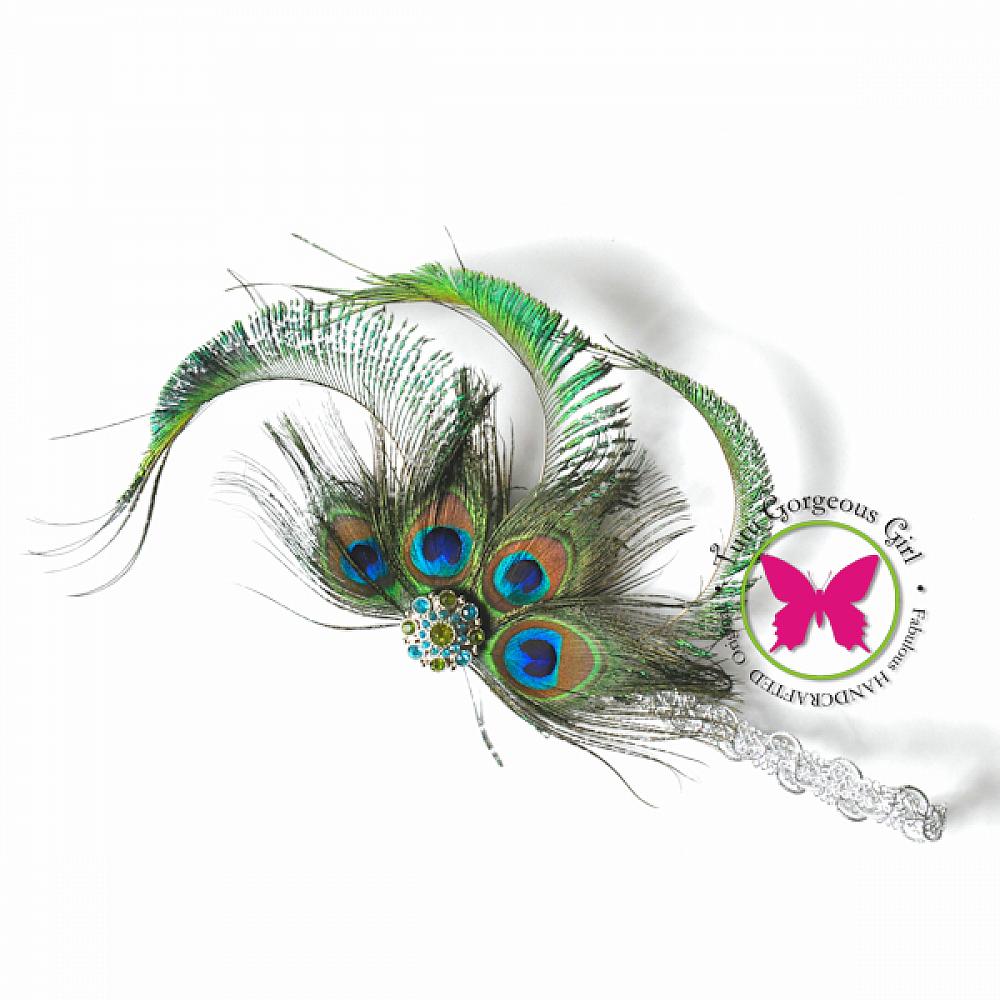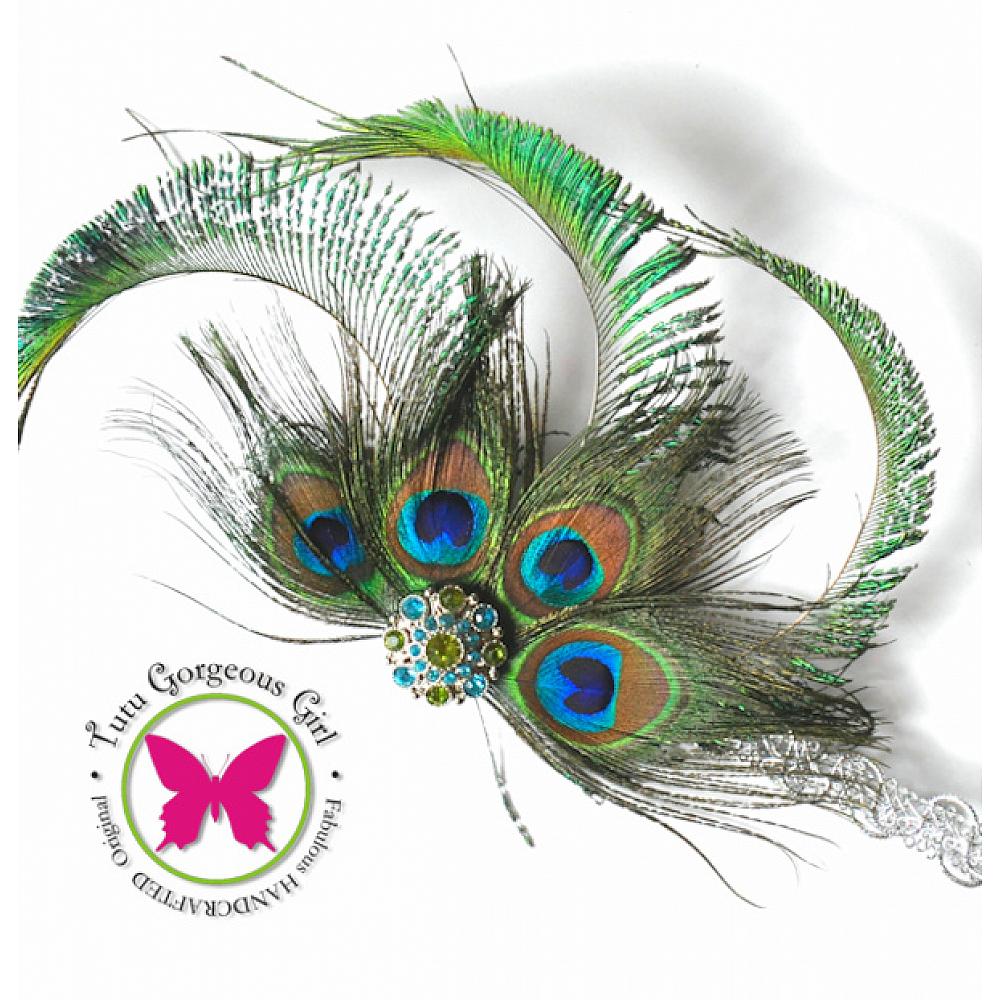This roaring 20's inspired peacock hair accessory is made with peacock eye feathers, hand curled peacock swords, and a silver rhinestone centerpiece.