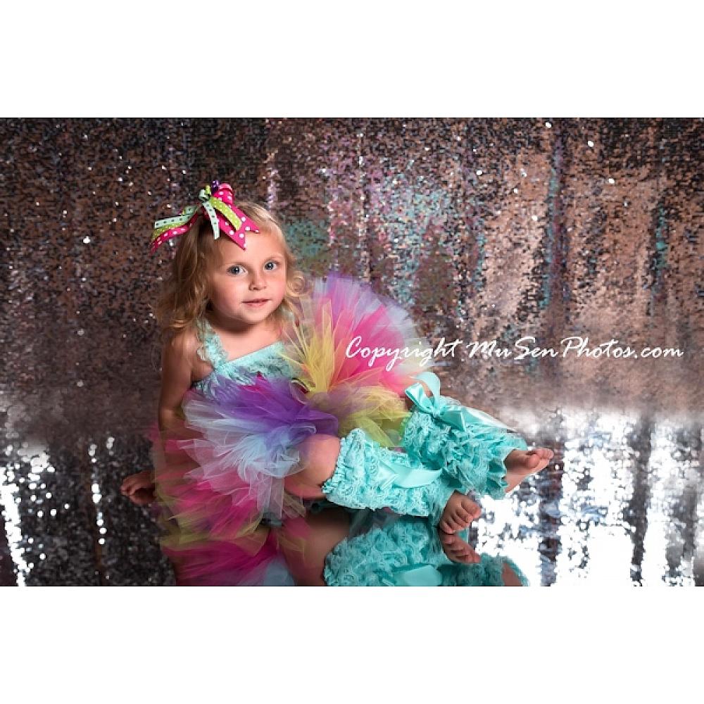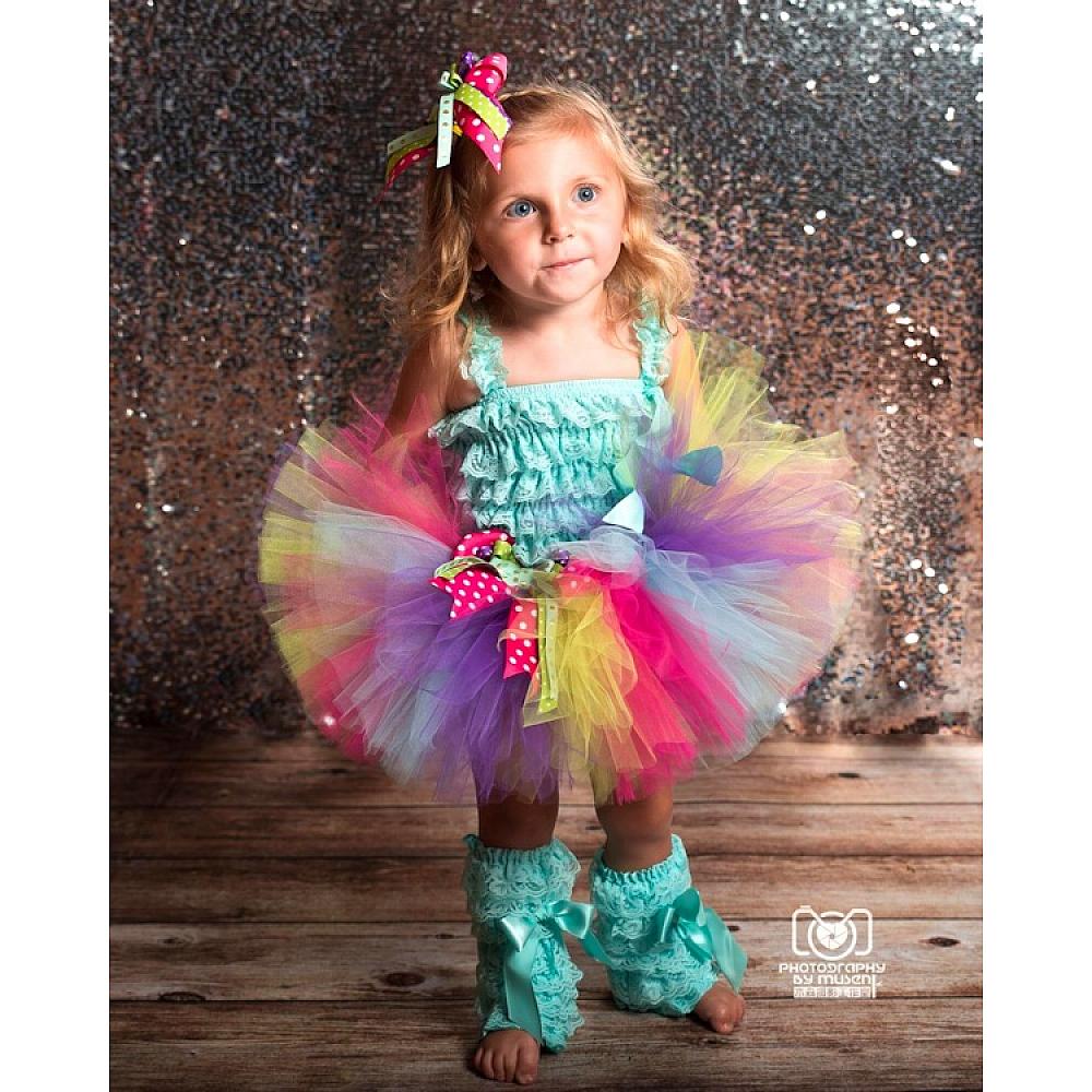 The Pinwheels and Posies birthday tutu features aqua, hot pink, purple, and lime green tulle. Tutu includes a fun polka dot layered bow clip at the waist, and optional matching headband. This tutu is perfect for a first birthday, milestone or cake smash photo session tutu, or summer portrait tutu.