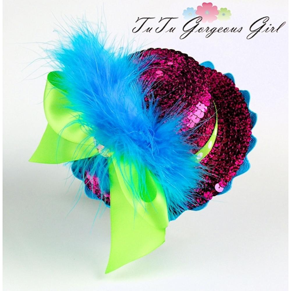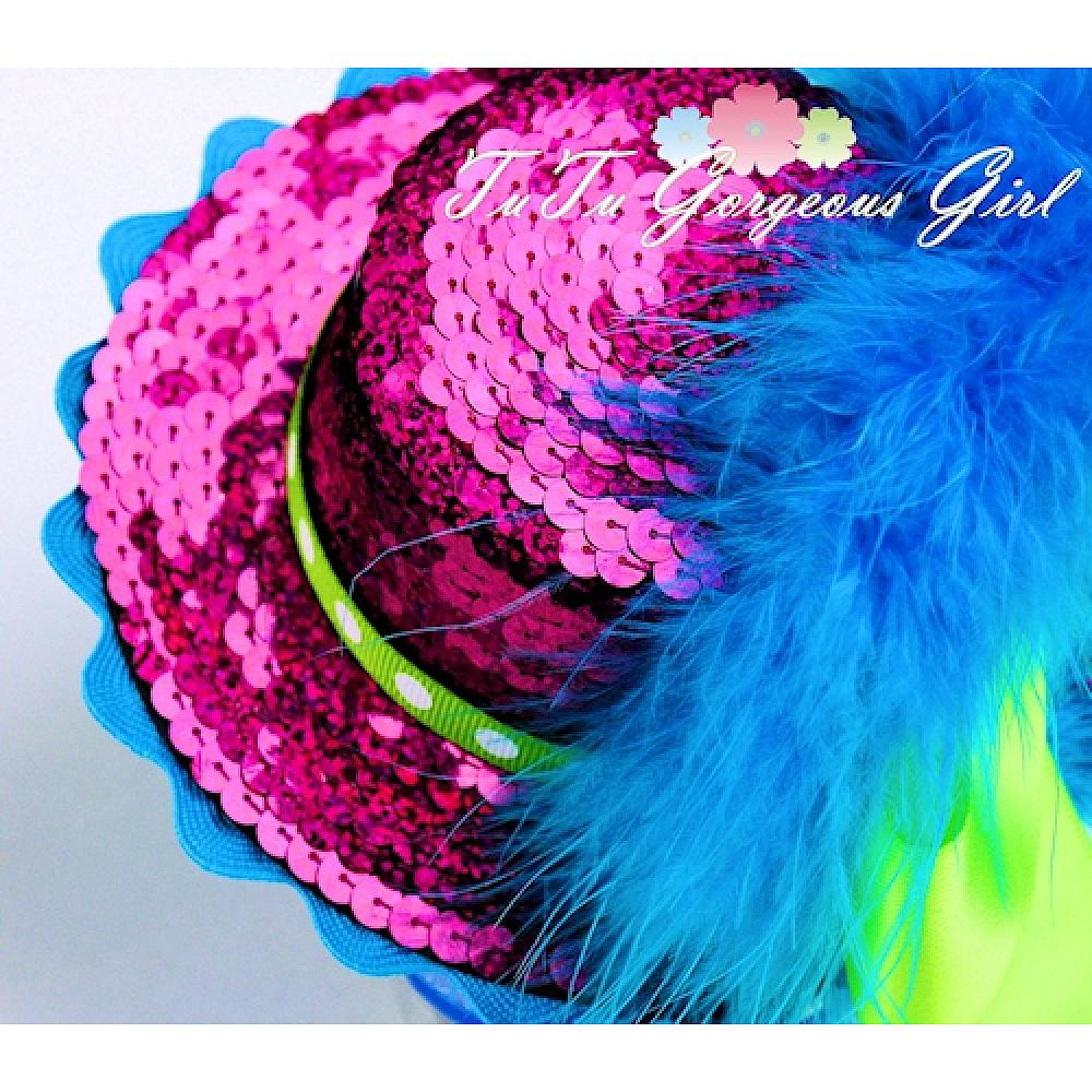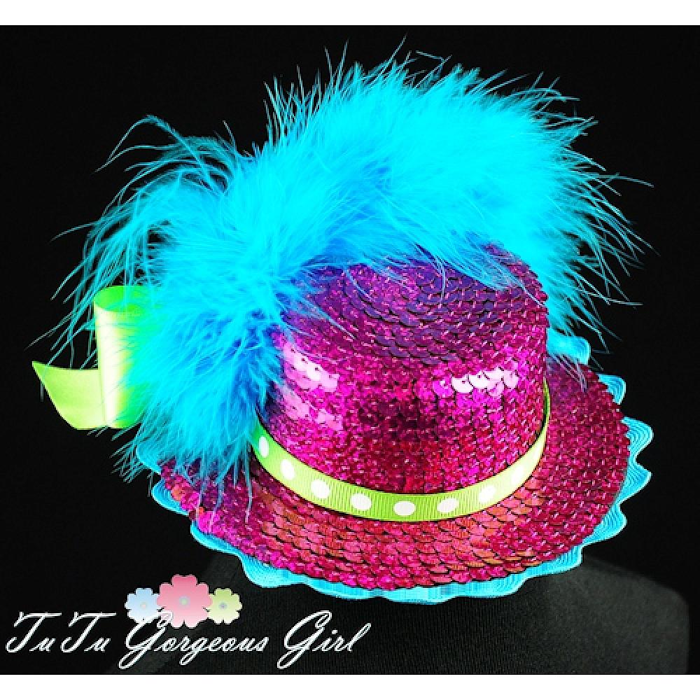 This fun mini top hat is handmade with hot pink sequins, turquoise ric rac for the edging around the brim, turquoise marabou and a lime green bow. This hat is a perfect accessory for a photo shoot, dance rectal, birthday hat, or Halloween costume. Hat measures 5 inches wide by 2 inches tall.