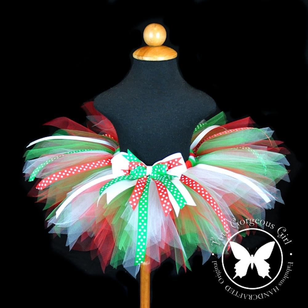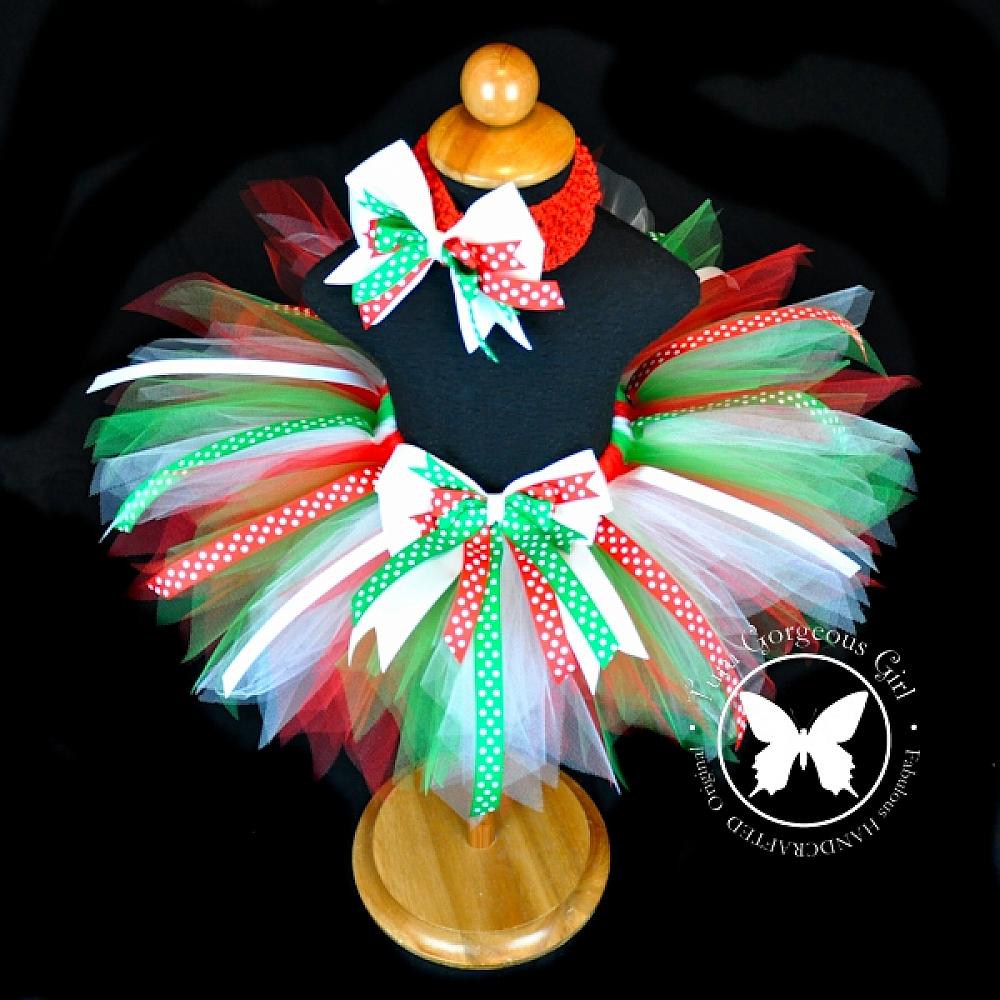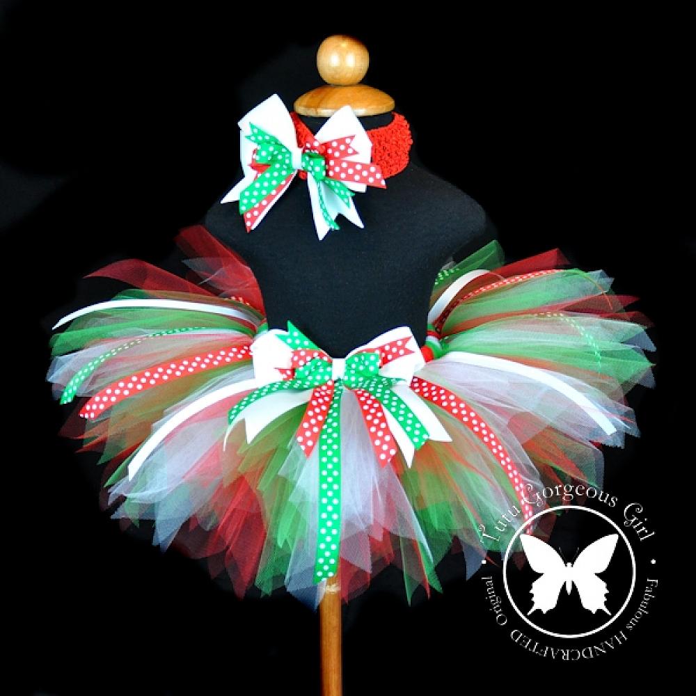 Red White Green Christmas Tutu with Polka Dot Ribbon Streamers / Holiday Tutu