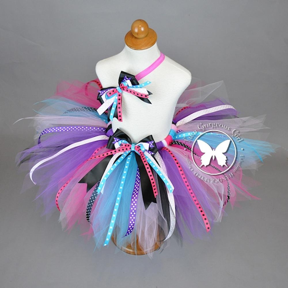 Girls hot Pink, purple, white, turquoise, and black birthday tutu with polka dot ribbon streamers. Tutu features a layered bow clip at the waist and optional hair bow.