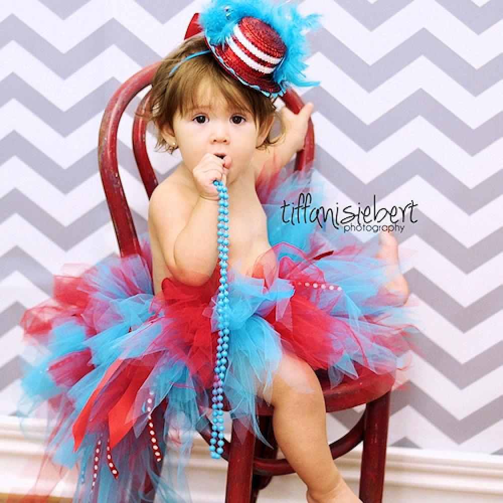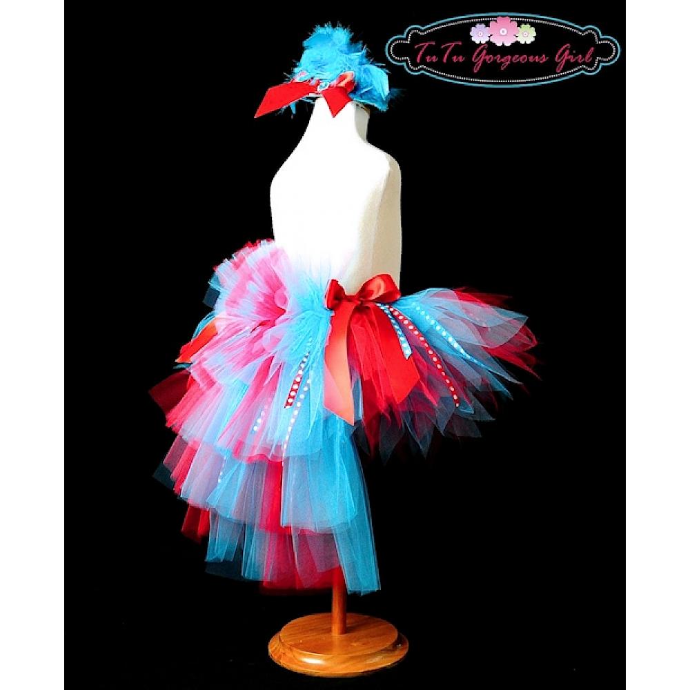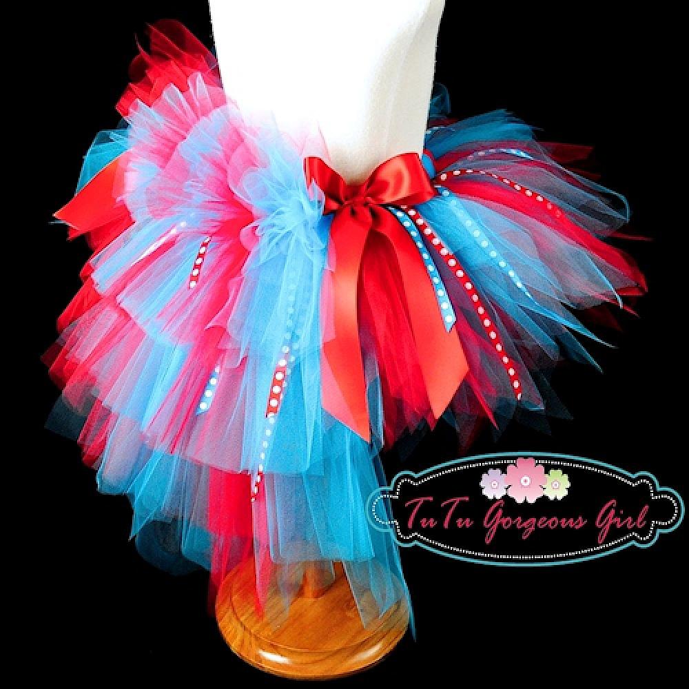 This bustle tutu is perfect for a Dr. Seuss themed birthday party or Halloween costume. The bustle tutu is made with red and turquoise tulle and sewn throughout the top layers of tulle are red and turquoise polka dot ribbons.