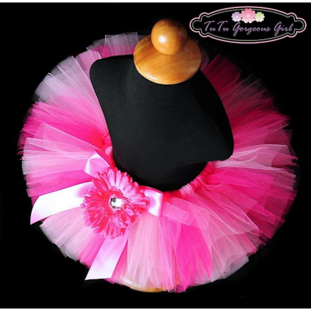The Pretty In Pink Tutu is made with pink, bubblegum and hot pink tulle, and makes a perfect newborn portrait tutu, birthday tutu, dance recital tutu or baby shower gift. Tutu includes a satin bow at the waist and optional flower clip and stretch headband.