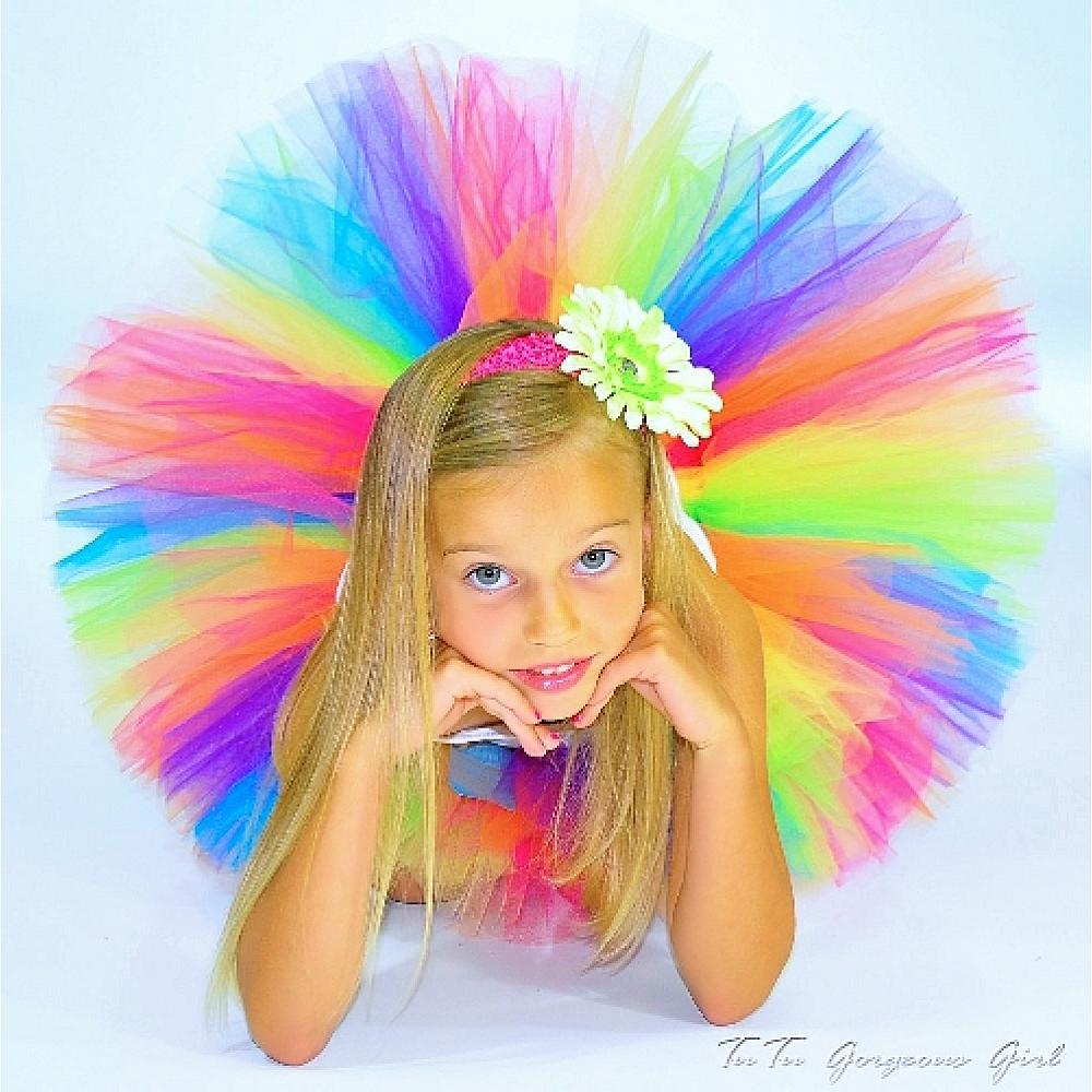 The Candy Rainbow birthday tutu showcases all the brightest colors of the rainbow! This colorful and fun tutu is perfect for a rainbow themed birthday party, dance tutu, Halloween clown costume or photo prop. The Candy Rainbow tutu features orange, yellow, lime green, purple, hot pink and turquoise in a rainbow striped pattern. Tutu includes a satin bow at the waist and optional flower clip and stretch headband.