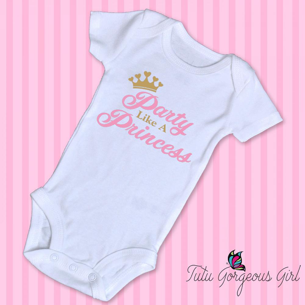Baby girls pink and sparkle gold Party Like A Princess birthday shirt. This white onesie features bubble gum pink and sparkle gold lettering with a cute gold princess crown. Perfect for a 1st birthday, 2nd birthday or baby shower gift.