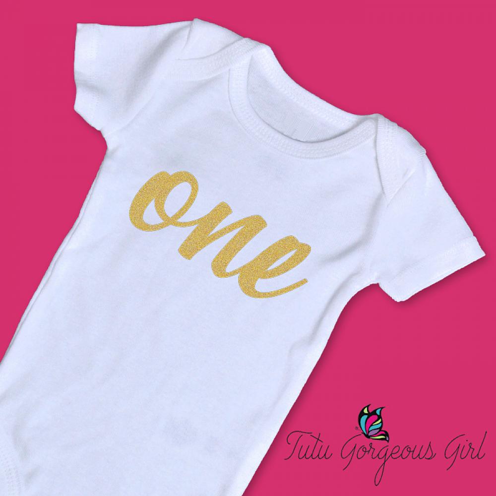 This first birthday onesie features the word ONE in sparkle gold script. Or you may choose a different color from our color chart and leave your color preference in your order notes.