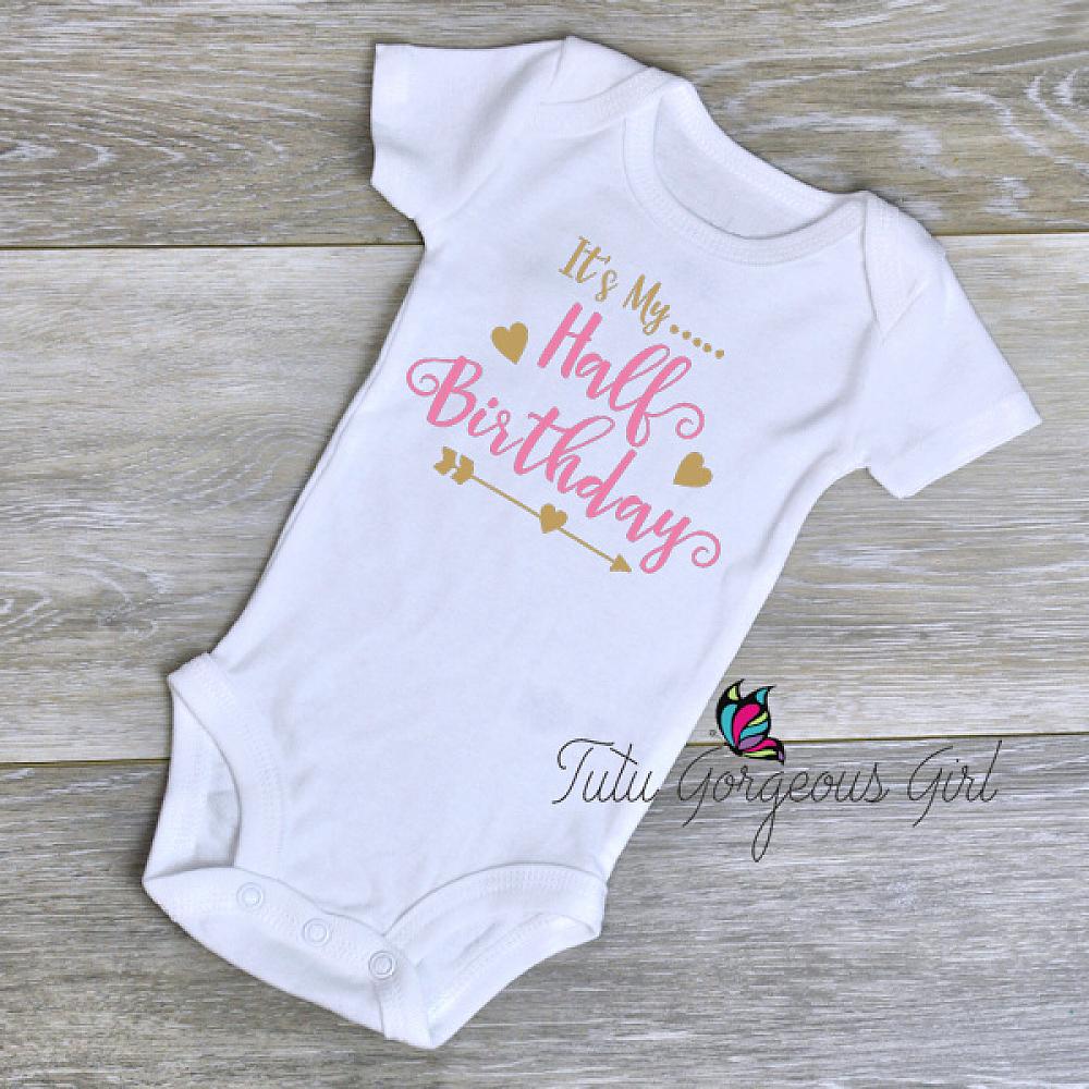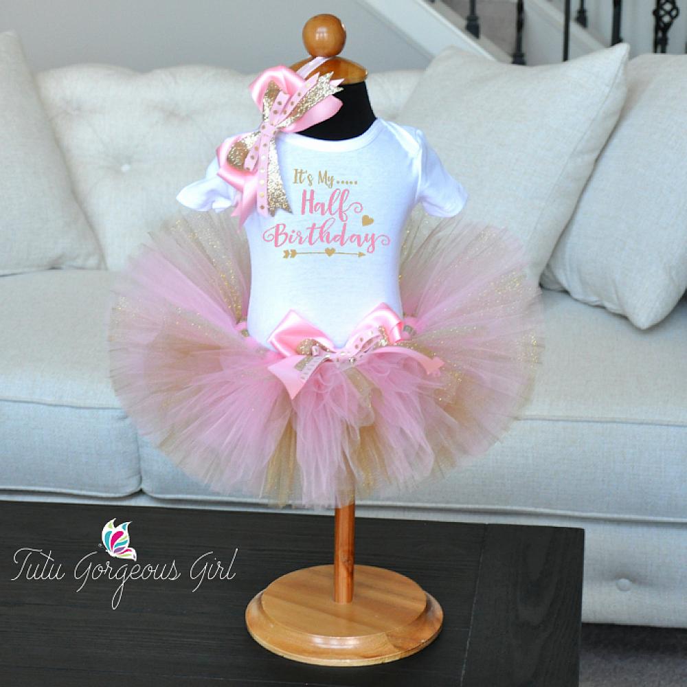 It's My Half Birthday pink and sparkle gold tutu, bodysuit and hair bow. Tutu is made with light pink and sparkle gold tulle and features a layered bow clip at the waist. Tutu is 6 inches in length. The white bodysuit features pink and sparkle gold decal. The matching hair bow/headband is optional.