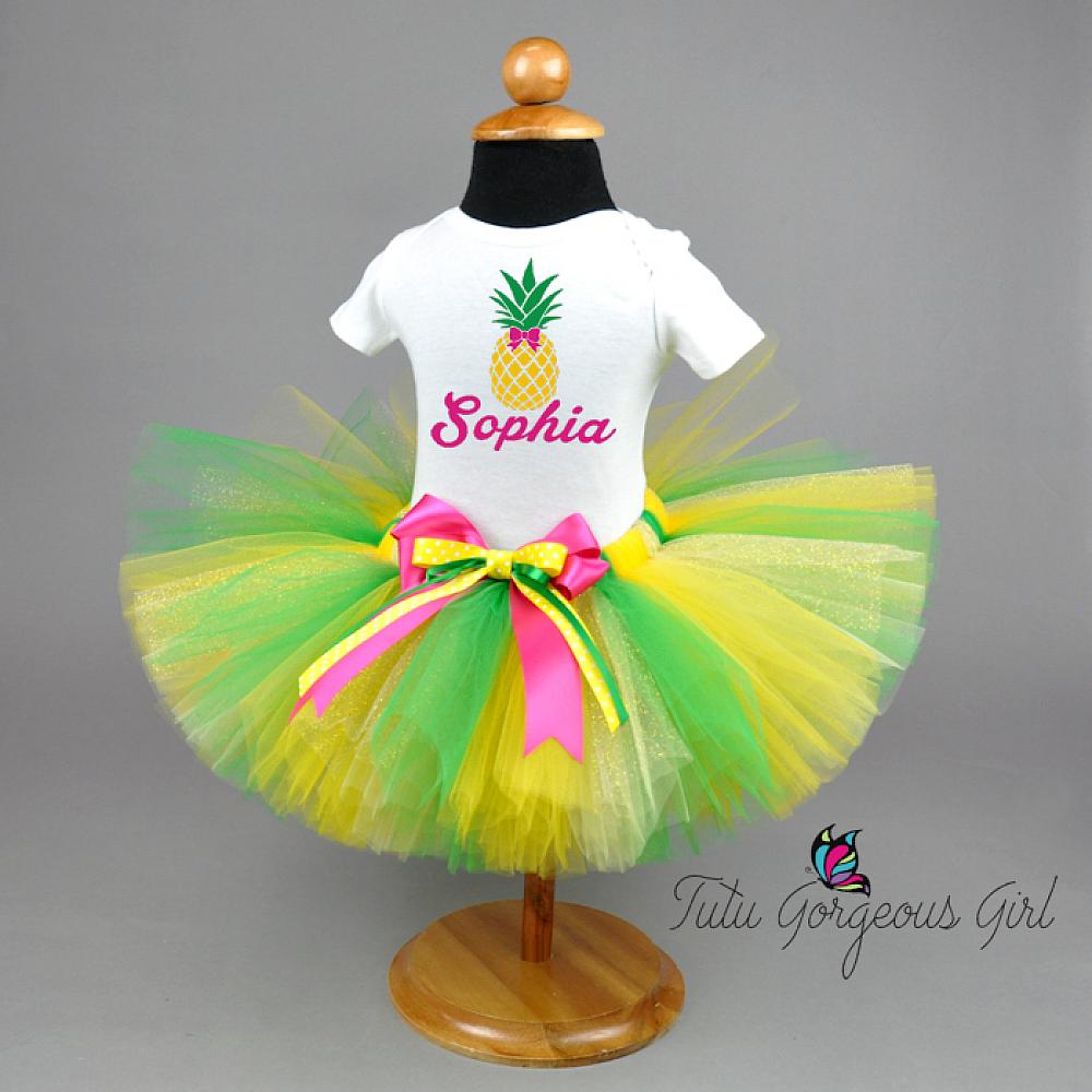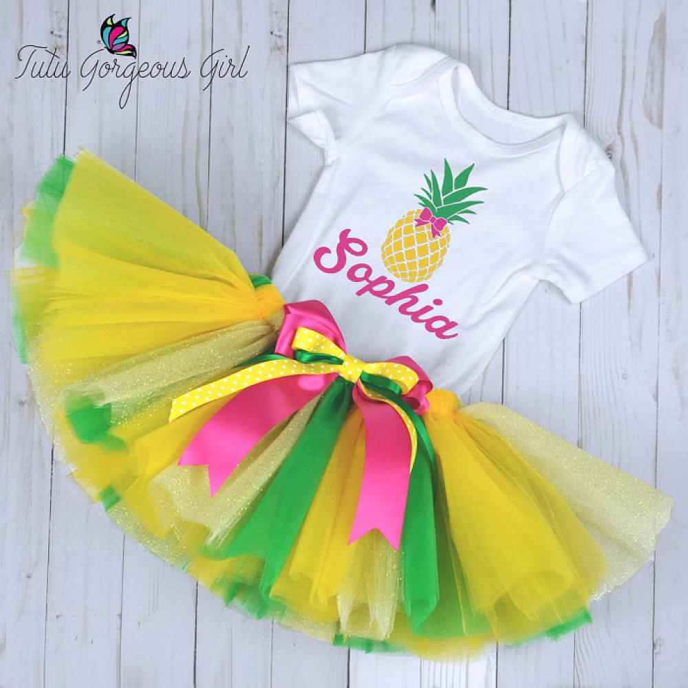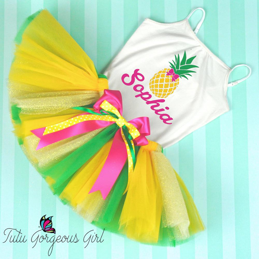 This fun personalized pineapple birthday outfit is a perfect choice for your little girl's birthday. Tutu is made with yellow, green and sparkle gold tulle and includes a hot pink layered bow clip at the waist. The white cami style shirt features a yellow and green pineapple, and hot pink name underneath.