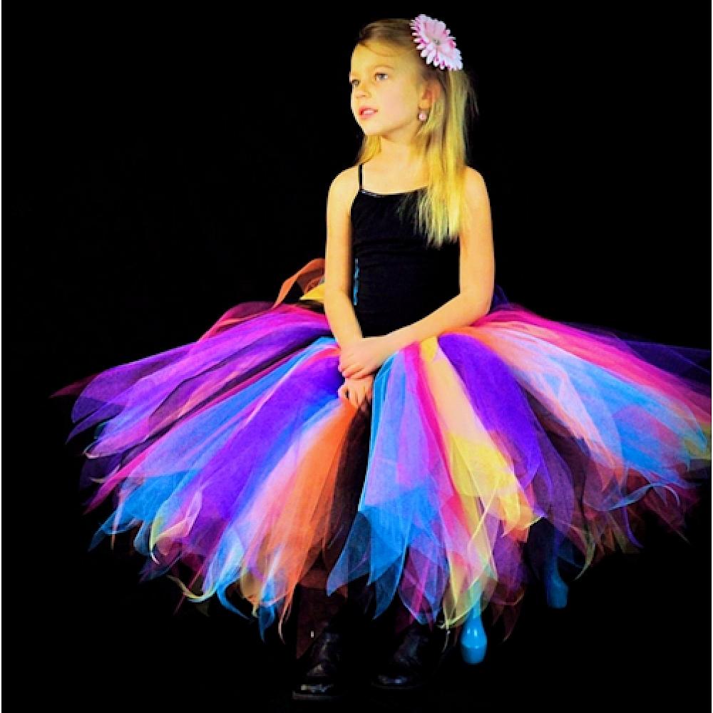 The Glam Girl tutu is a fun and colorful pixie cut tutu made with bold stripes of turquoise, hot pink, yellow, black, purple and orange tulle. Tutu includes a satin bow at the waist and optional flower clip and headband.