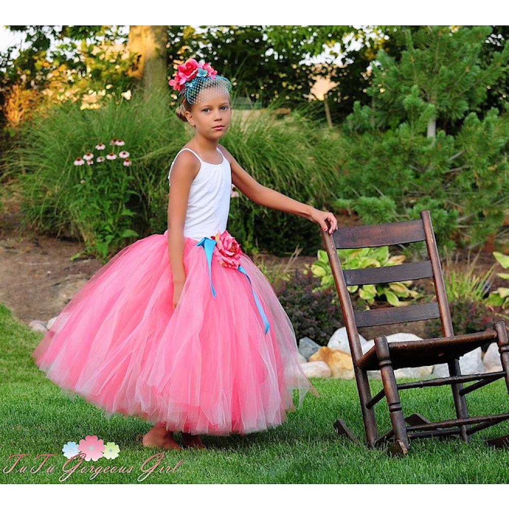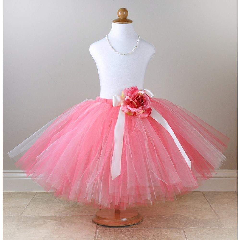 This beautiful long coral tutu is perfect for flower girls, a special occasion or portraits. The tutu is made with coral and ivory tulle. Tutu includes an ivory satin bow at the waist and optional rose flower clip.