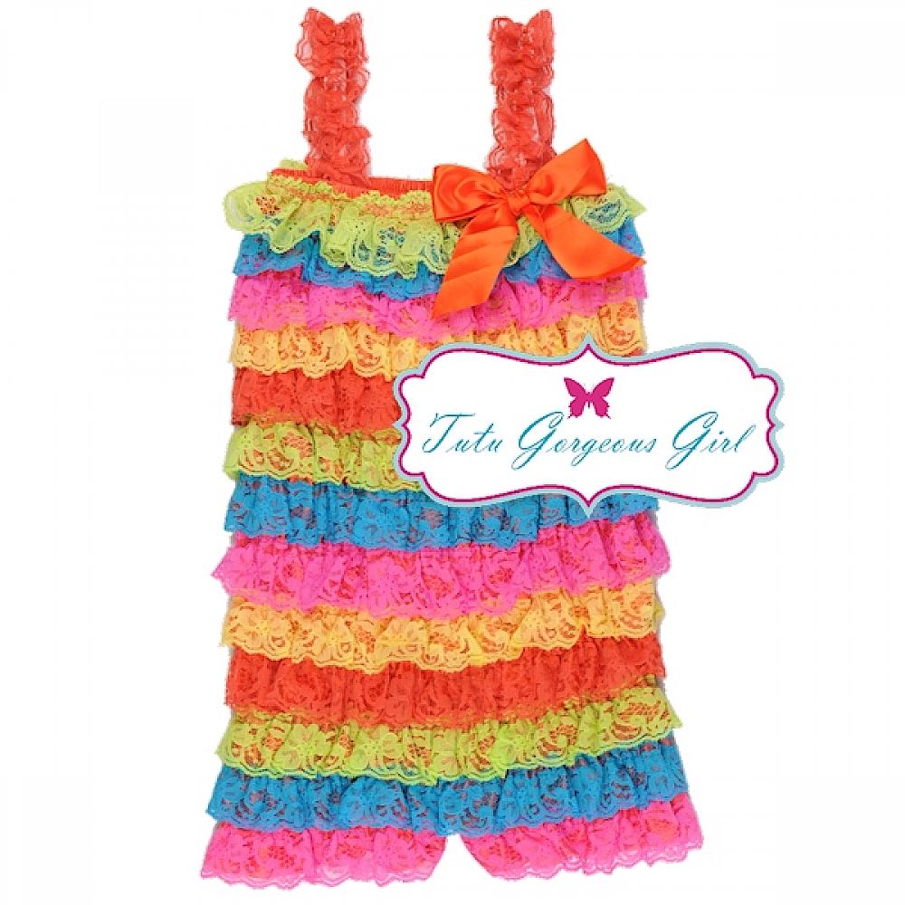 This colorful rainbow lace petti romper features yellow, orange, lime, turquoise and fuchsia lace ruffles.