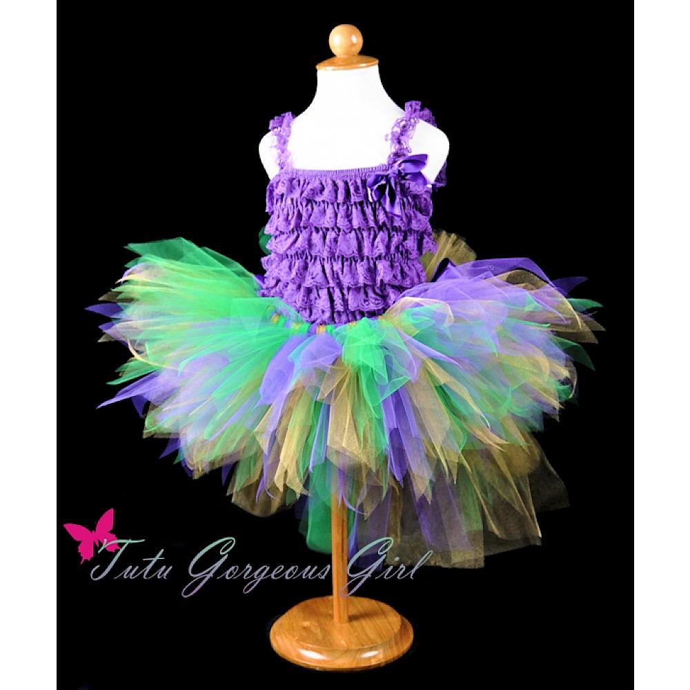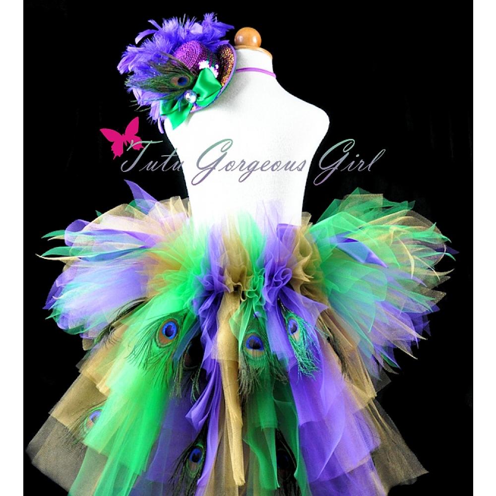 Girls Mardi Gras Peacock Tutu / Green Purple Gold Bustle Tutu with Peacock Feathers