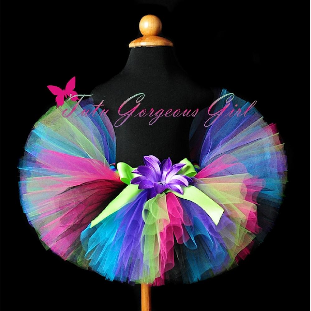 The Rocker Girl tutu features lime, purple, turquoise, black and hot pink tulle. This classic style tutu is a fun choice for a Rock Star themed birthday party, Halloween costume or photo prop. Tutu includes a satin bow. Flower clip and crochet headband can be added to your purchase below.