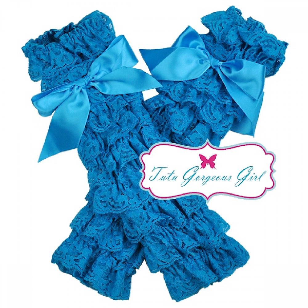 These turquoise lace petti leg warmers are a perfect choice for portraits, a birthday girl or special occasion. The leg warmers are made with layers of soft lace ruffles, and are suitable for ages 6 months to approximately age 6 years.