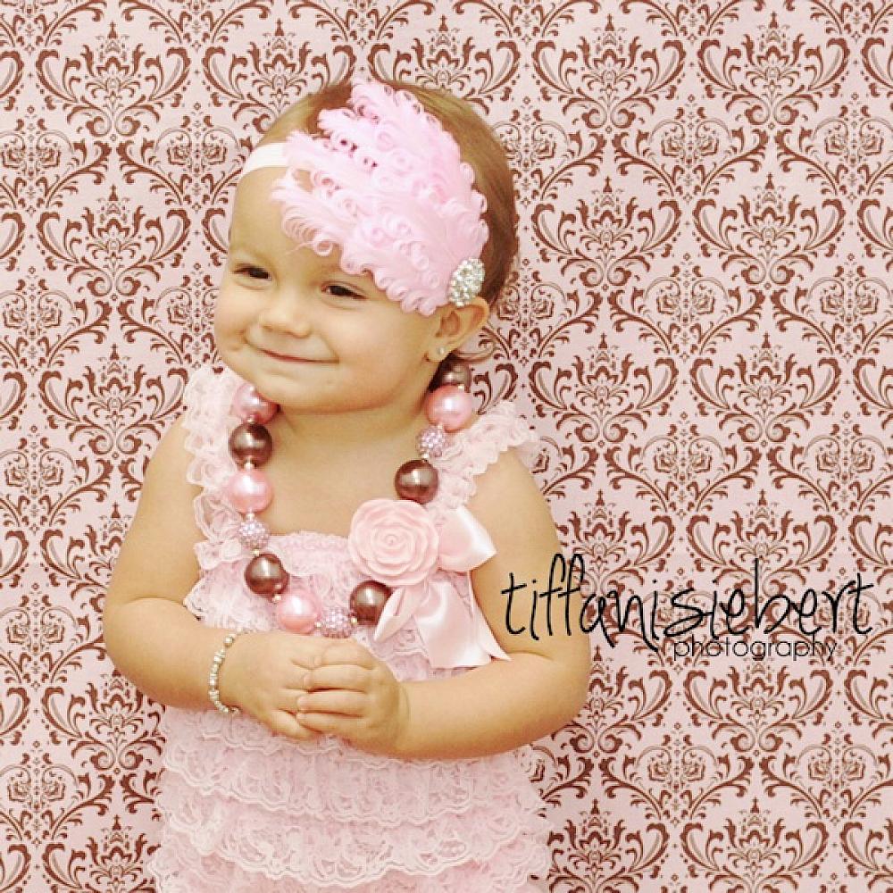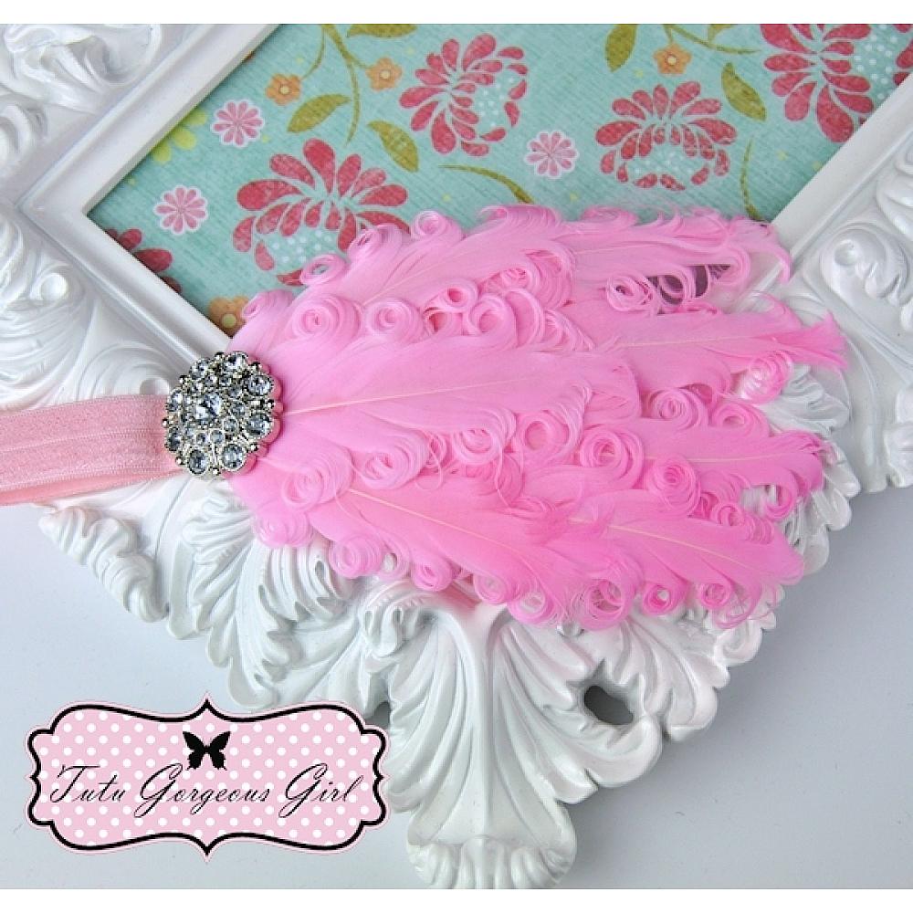 This light pink curly feather headband features a beautiful rhinestone decorative piece and light pink satin stretch elastic headband. This head piece is a stunning choice for portraits, a special occasion or everyday wear.